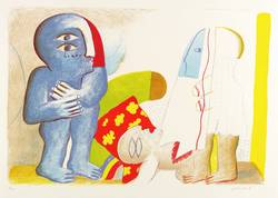 Horst Antes (*1936 Heppenheim - lebt und arbeitet in Karlsruhe, Berlin und Castellina in Chianti / Italien). Deutscher Maler, Grafiker und Bildhauer. Studierte Malerei 1957-59 bei HAP Grieshaber an der Akademie der Bildenden Künste Karlsruhe. Seit 1967 Professor für Malerei an der Akademie Karlsruhe. 1962 Villa Romana Florenz, 1963 Villa Massimo Rom. 1963 Ausstellung der ersten plastischen Kopffüßler-Figur. 1967 Metallplastiken zum Garten der sieben Denkmäler der Lüste anlässlich der Bundesgartenschau für den Botanischen Garten in Karlsruhe. 1968 Gastprofessur an der Hochschule für Bildende Künste Berlin. Seit 1983 Mitglied der Freien Akademie der Künste Hamburg. - Seine monolithisch wirkenden, oft gnomenhaft körperlosen Figuren weisen Ankläge von spätem Kubismus und Surrealismus auf.