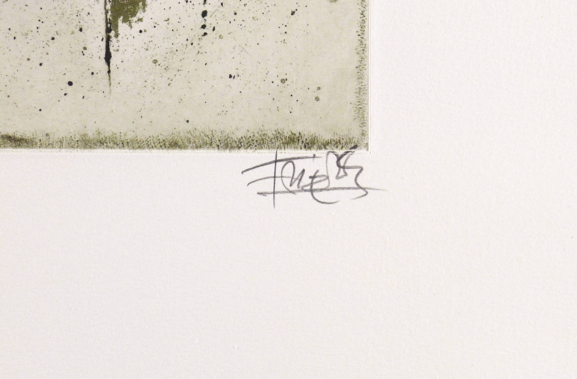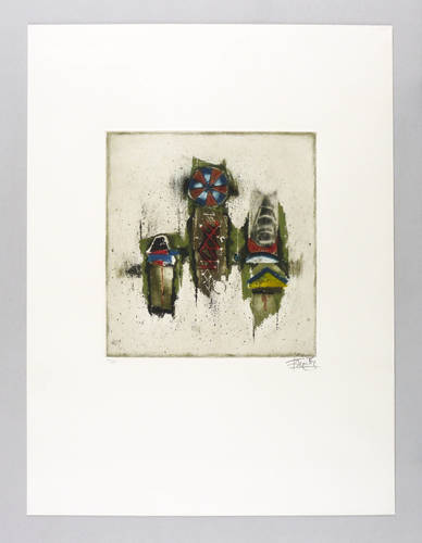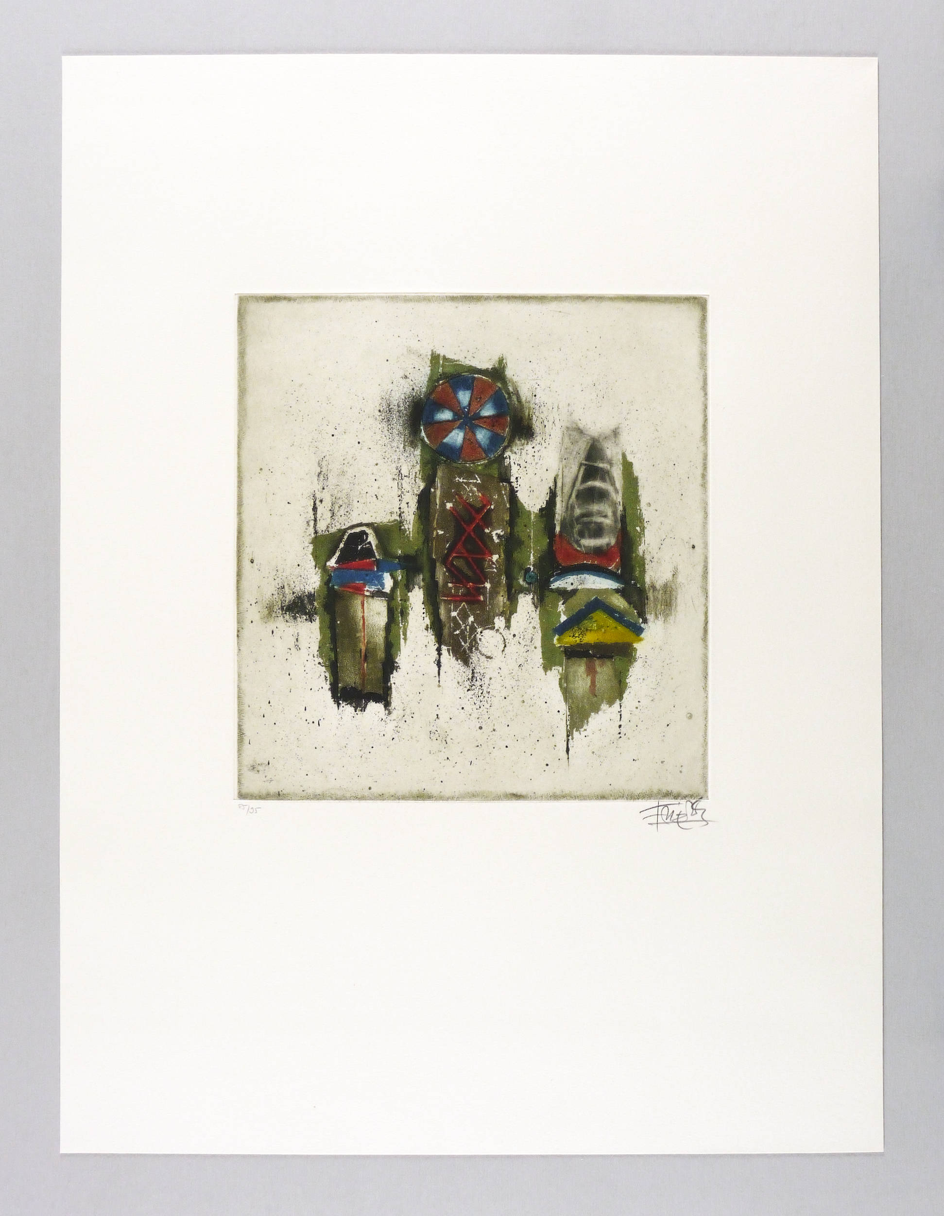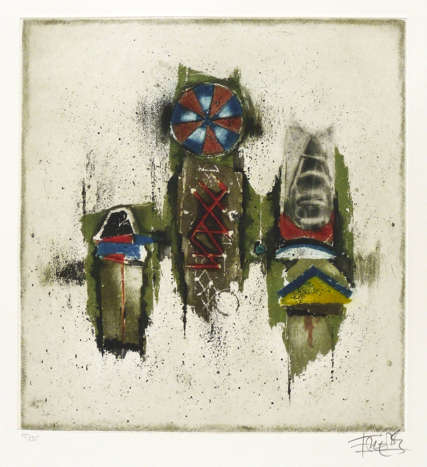 1986. Farbradierung / Aquatinta, in 8 Farben, auf festem hellchamois BFK Rives. – Originale Künstlergrafik, von Johnny Friedländer. – Auflage Exemplar Nr. 85/95. – 29,9 x 27,8 cm (Darstellung / Platte), 65 x 49 cm (Blatt).