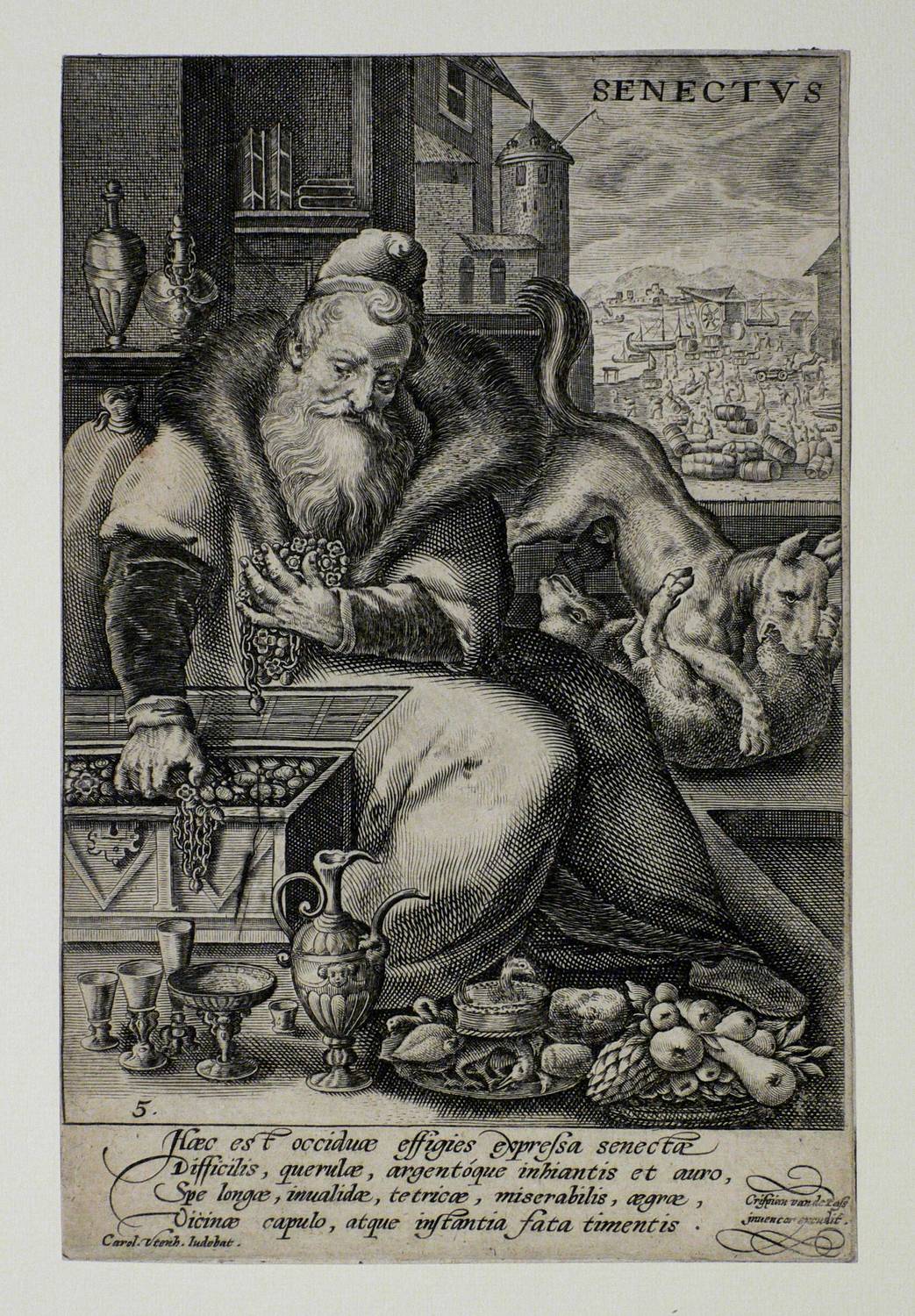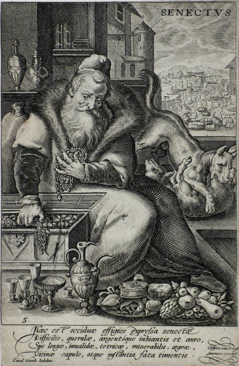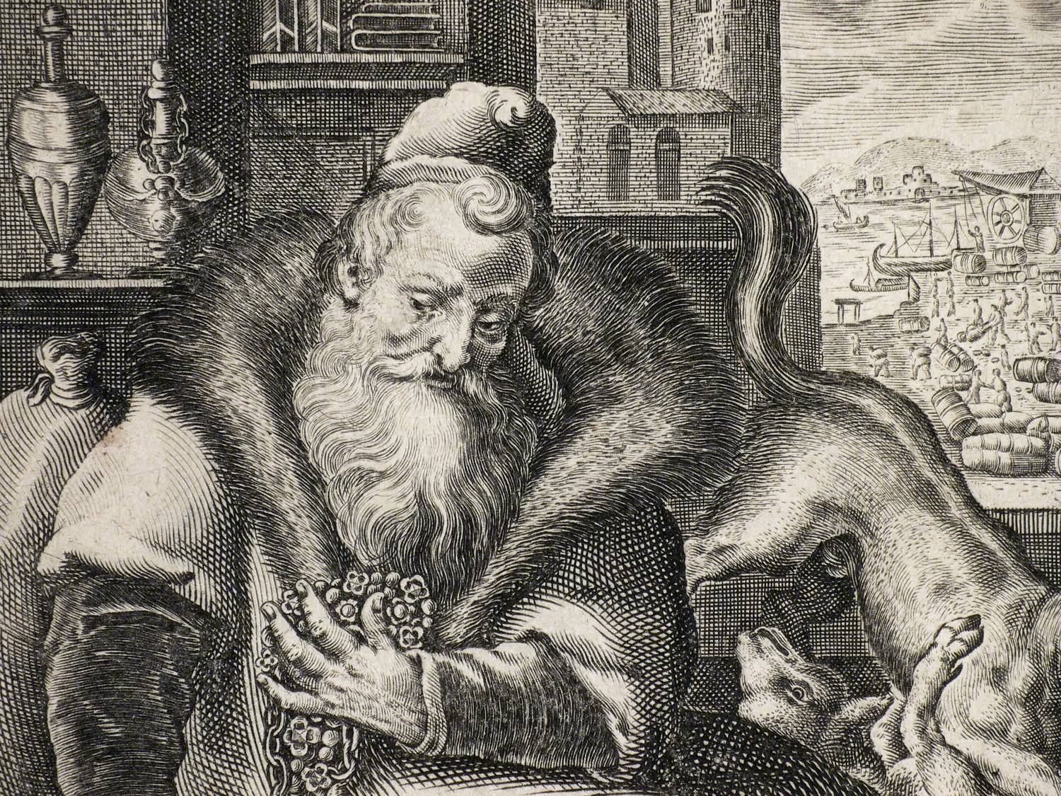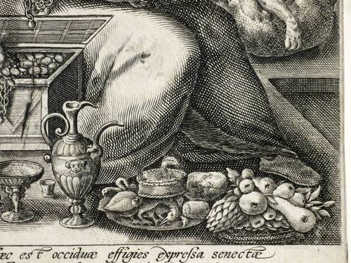 Hollstein Dutch and Flemish 497. Franken 1096. – In der Platte unten rechts signiert. Titel oben rechts. Unterhalb der Darstellung ein lateinischer Vierzeiler: ″Haec est occiduae expressa senectae Difficilis, querulae, argentoque inhiantis et auro, Spe longae, invalidae, tetricae, miserabilis, agrae, Vicinae capulo, atque instantia fata timentis.″. Blatt in der Darstellung unten links nummeriert: ″5″. - Wasserzeichen Krone über Wappenschild mit drei übereinander gesetzten Andreas-Kreuzen. – Blatt Nr. 5 aus einer Folge von 6 Blättern zu den Lebensaltern des Mannes. Hier dargestellt der zu Wohlstand und gesellschaftlichem Ansehen gelangte Alte. - Der Vierzeiler entstammt der Feder des Dichters und Gelehrten Karl Utenhoven (1500-1580). – Blatt umlaufend auf die Plattenkante beschnitten. Im Bereiich der Signatur oberflächlich geringfügig berieben. Fachgerecht im Passepartout montiert. Insgesamt in einem dem Alter entsprechend sehr guten Zustand.