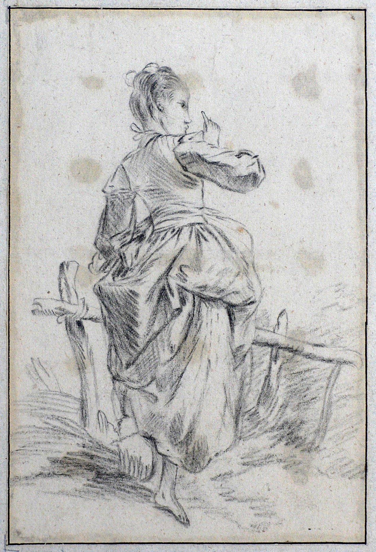 Deutscher Zeichner. – „Wartendes Mädchen am Weidezaun”.