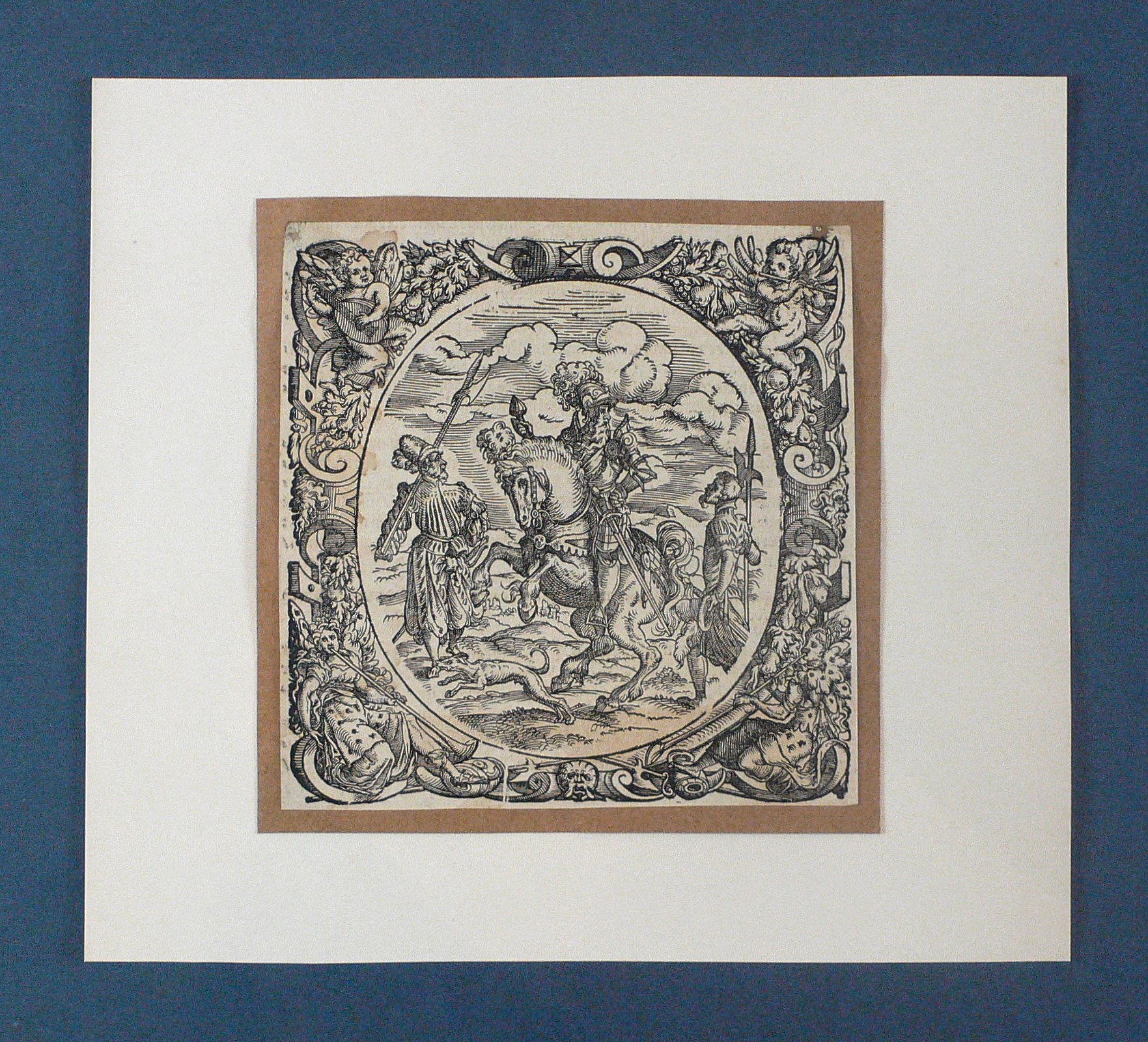 Aus: Leonhardt Fronsberger, Von Kayserlichem Kriegßrechten, Malefitz und Schuldhändlen, Ordnung und Regiment (Frankfurt am Main: Feyerabend & Hüter 1566). – Verso typografischer Rückentext aus dem Kriegsbuch von Fronsberger. – Bis knapp an den Darstellungsrand beschnitten und am oberen Rand alt auf hellbraunen Karton aufgelegt. Insgesamt gut erhalten.