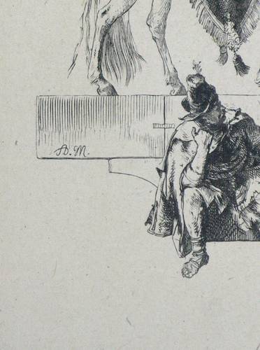 Bock 878 I (von II). – Im Sockel links die Signatur: "A.M.", rechts vertikal: VNZELMANN". – Probedruck vor den Buchausgaben der "Zweihundert Illustrationen zu den Werken Friedrichs des Großen" (1846-57 & 1882). – Hervorragend erhaltenes Blatt.