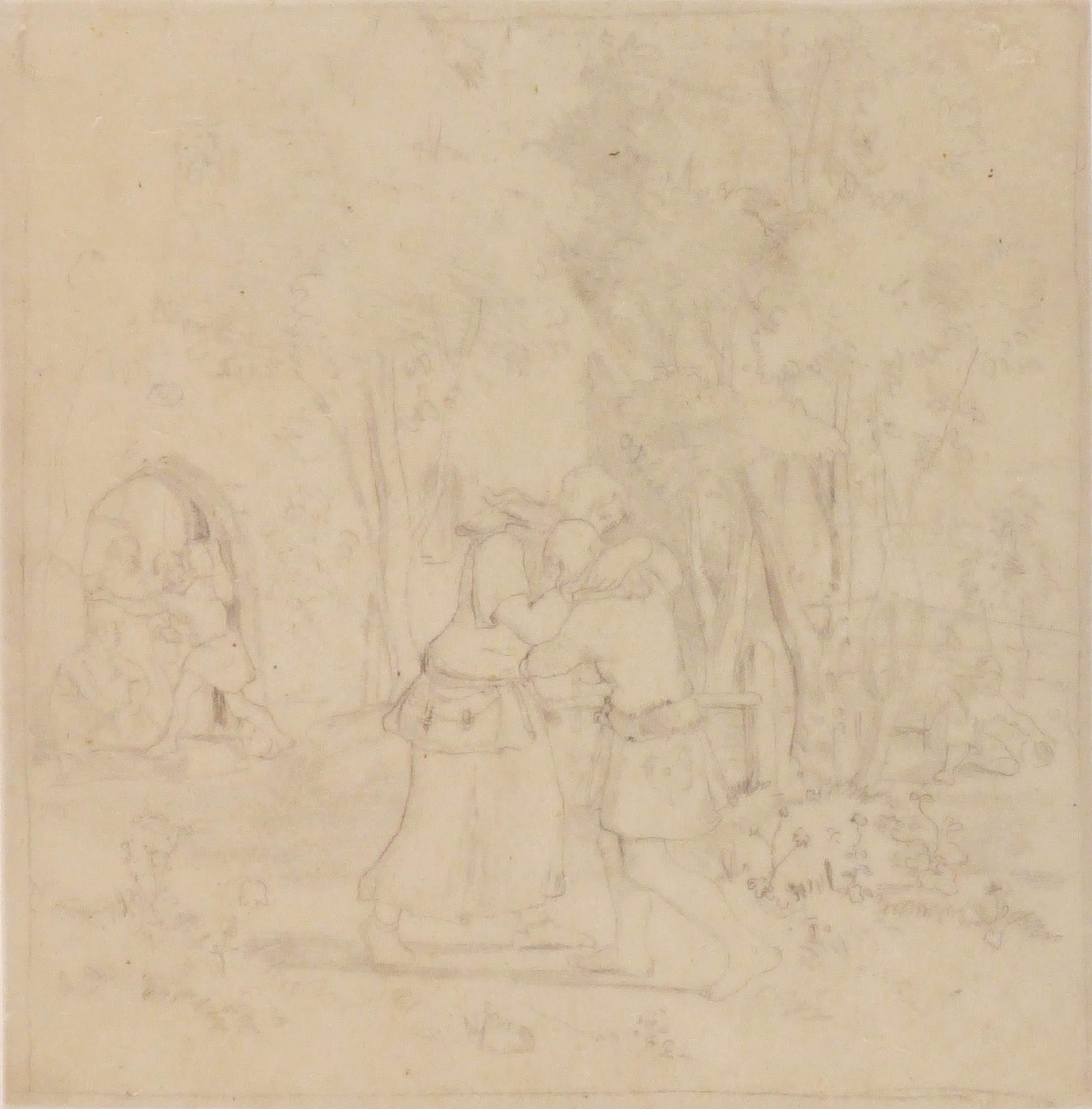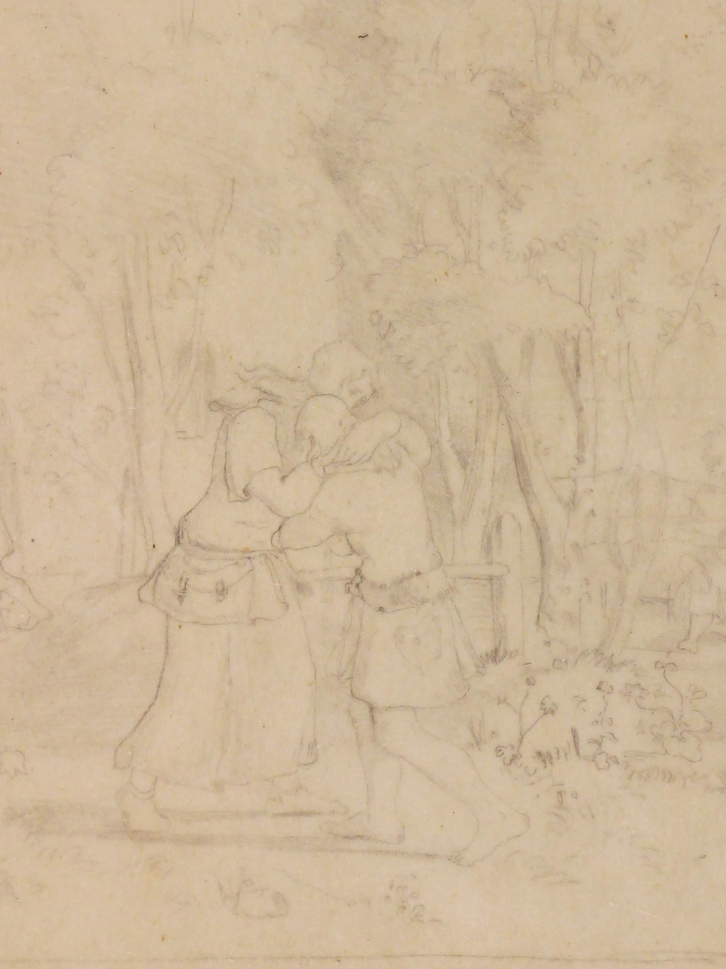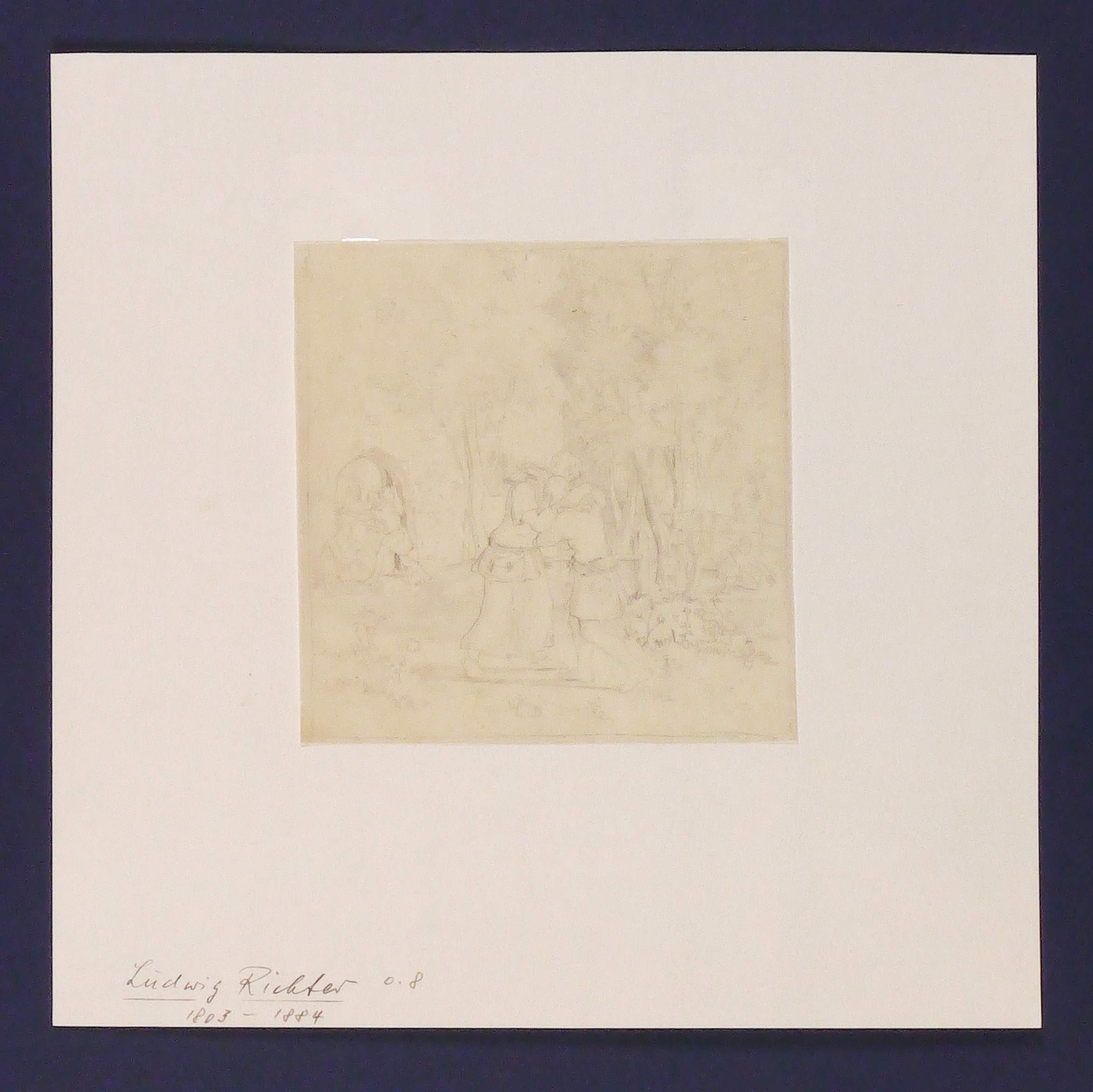 Auf dem Trägerpapier von fremder Hand in Bleistift bezeichnet ″Ludwig Richter 1803-1884″. – Wohl Vorzeichnung zu einer Illustration. – Papier etwas gebräunt. Auf Trägerpapier montiert. Gut erhalten.