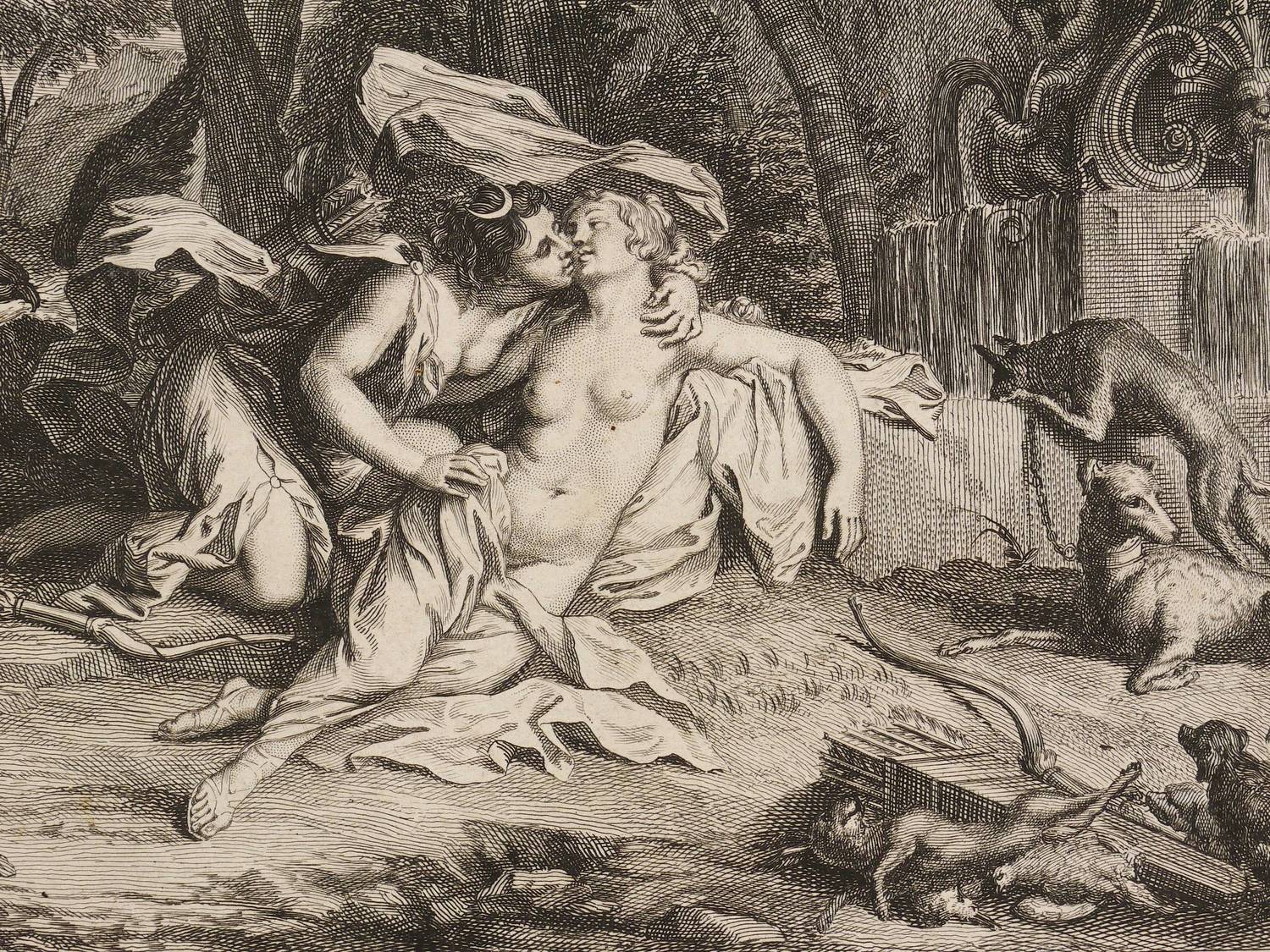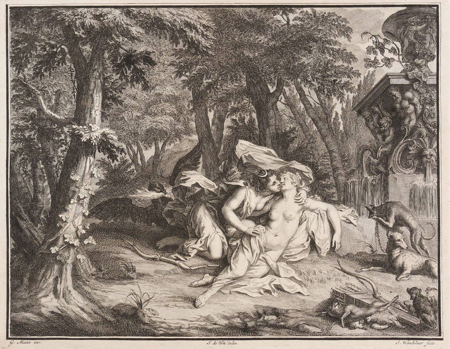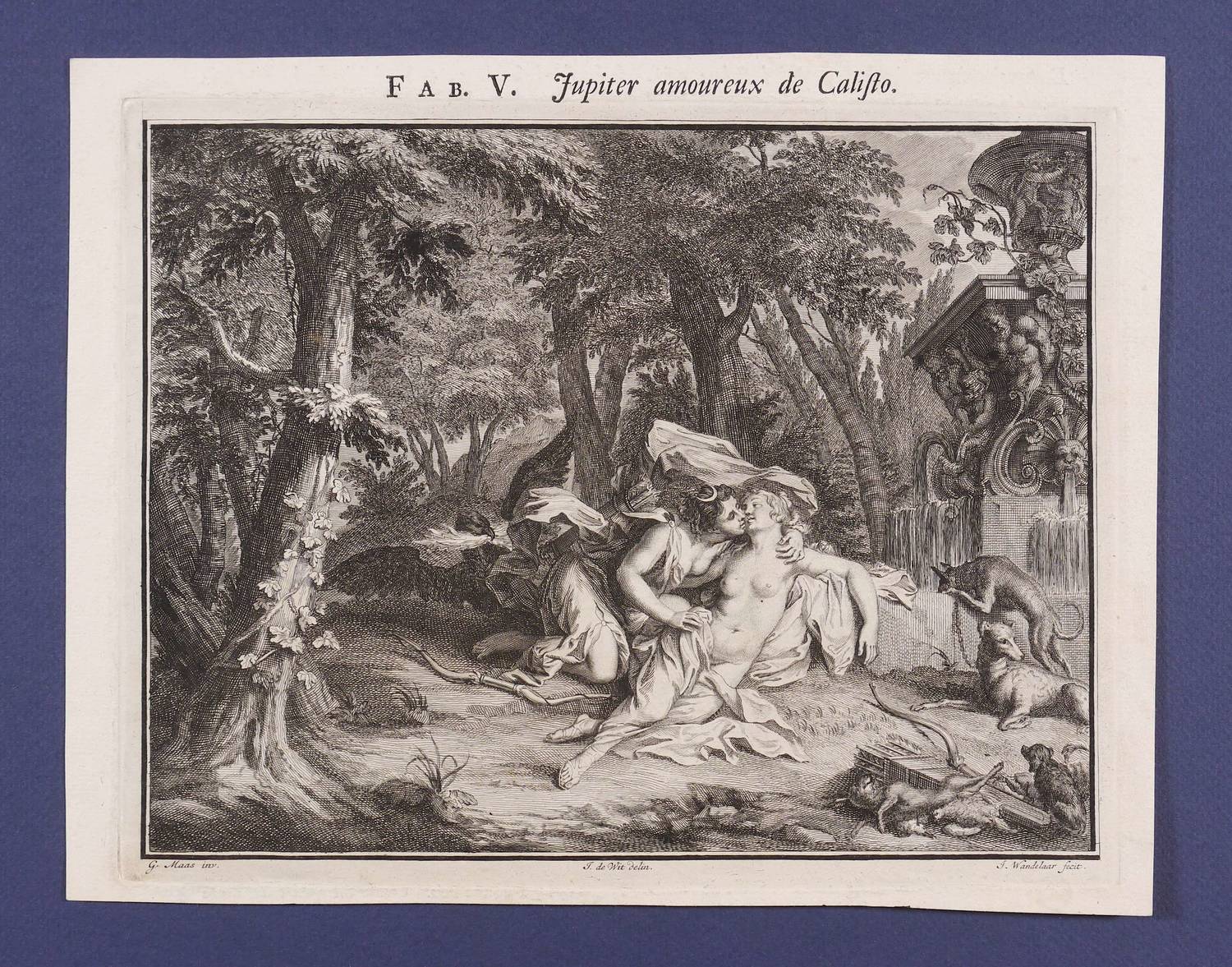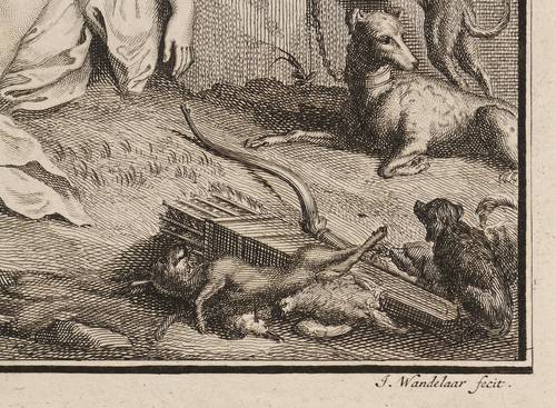 Aus: Antoine Banier, Les Metamorphoses d'Ovide traduites en françois. Avec des Remarques et des Explications historiques (Amsterdam: Wetstein & Smith 1732). – Außerhalb der Darstellung in der Platte signiert rechts unten ″J. Wandelaar fecit″, mittig bezeichnet ″J. de Wit delin.″ und links ″G. Maas inv.″ Außerdem oberhalb der Darstellung außerhalb der Platte betitelt und links bezeichnet ″FAB. V.″ - Französischer Rückentext. – Papier etwas angeschmutzt und leicht berieben. Bis an den Plattenrand beschnitten. Insgesamt gut erhalten.