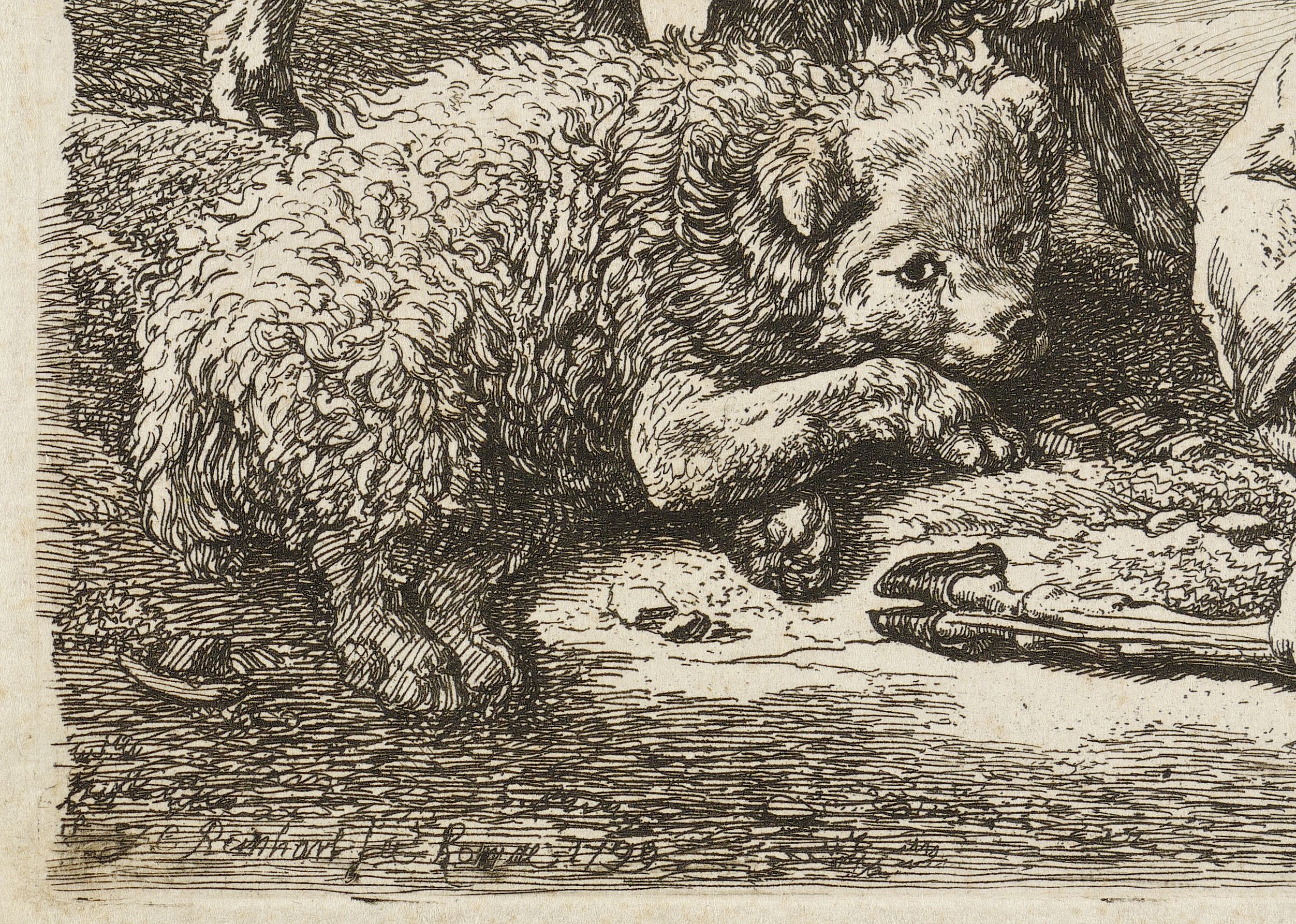 Feuchtmayr 82. Andresen 82. – In der Darstellung links unten signiert und datiert ″J.C. Reinhart fec. Romae 1799″. Verso in Bleistift bezeichnet ″Reinhart″. – Blatt 1 der Folge ″Die zweite Thierfolge″ mit 14 Blättern. – Schmalrandiges Exemplar. Etwas angeschmutzt. Verso stärker berieben. Insgesamt gut bis mäßig gut erhalten.