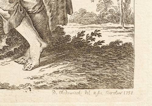 Daniel Nikolaus Chodowiecki (1726 Danzig - 1801 Berlin). Deutscher Kupferstecher, Grafiker und Illustrator. Bedeutender Vertreter der Kunst des Deutschen Klassizismus. Begann 1740 zunächst eine kaufmännische Lehre. Ab 1743 in der Haushaltswarenhandlung seines Onkels Antoine Ayrer in Berlin tätig. Letzterer unterstützte seine und seines Bruders Gottfried künstlerische Ausbildung und ließ beide von Johann Jakob Haid, Bernhard Rode und Johann Heinrich Meil unterrichten. Von den Ladengeschäften befreit, konnten sie sich 1754 mit Miniaturen und Emailmalereien selbstständig machen. Seit 1758 erste Radierversuche in allerlei Techniken wie Strichätzung, Aquatinta und Crayon-Manier. Frühe Verbindungen zu Verlegern von Almanachen und Kalendern beförderten diese Entwicklung. Vielbeschäftigt hat er Berlin nur selten verlassen. Eine längere Reise zu seiner Mutter nach Danzig im Jahre 1773 schlug sich dann entsprechend intensiv in seiner Arbeit nieder. Seit 1764 Mitglied der Königlich-Preußischen Akademie der Künste, ab 1797 deren Direktor.