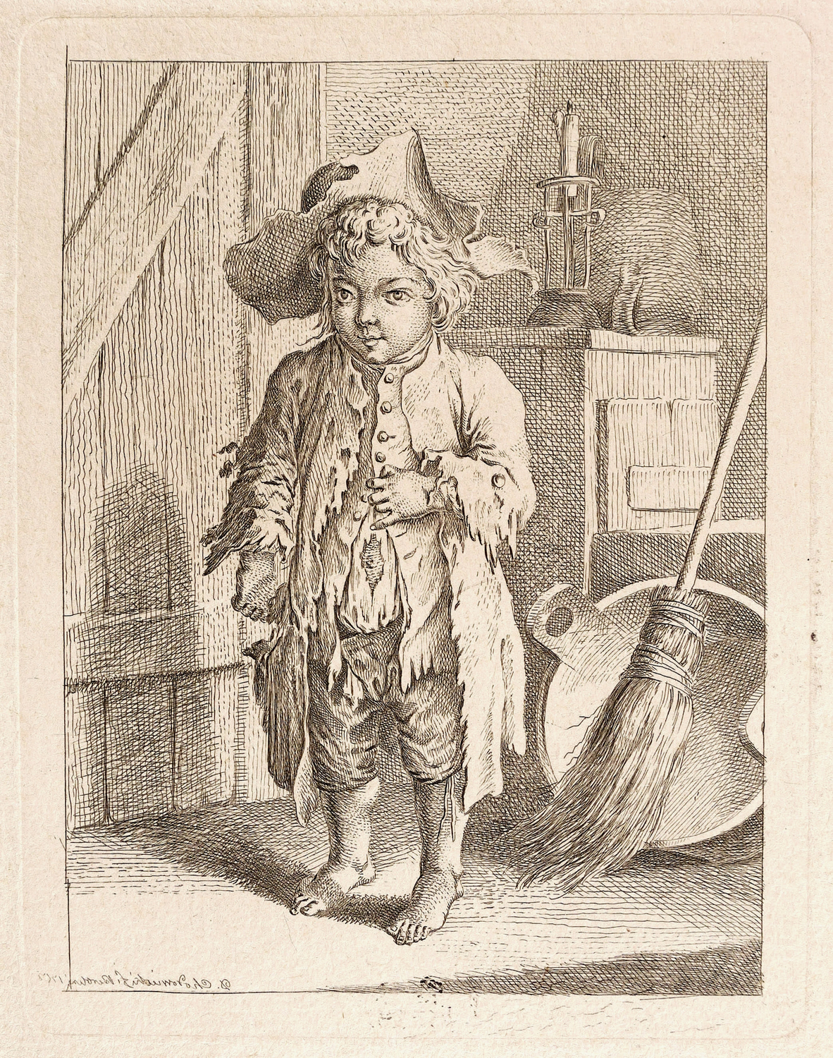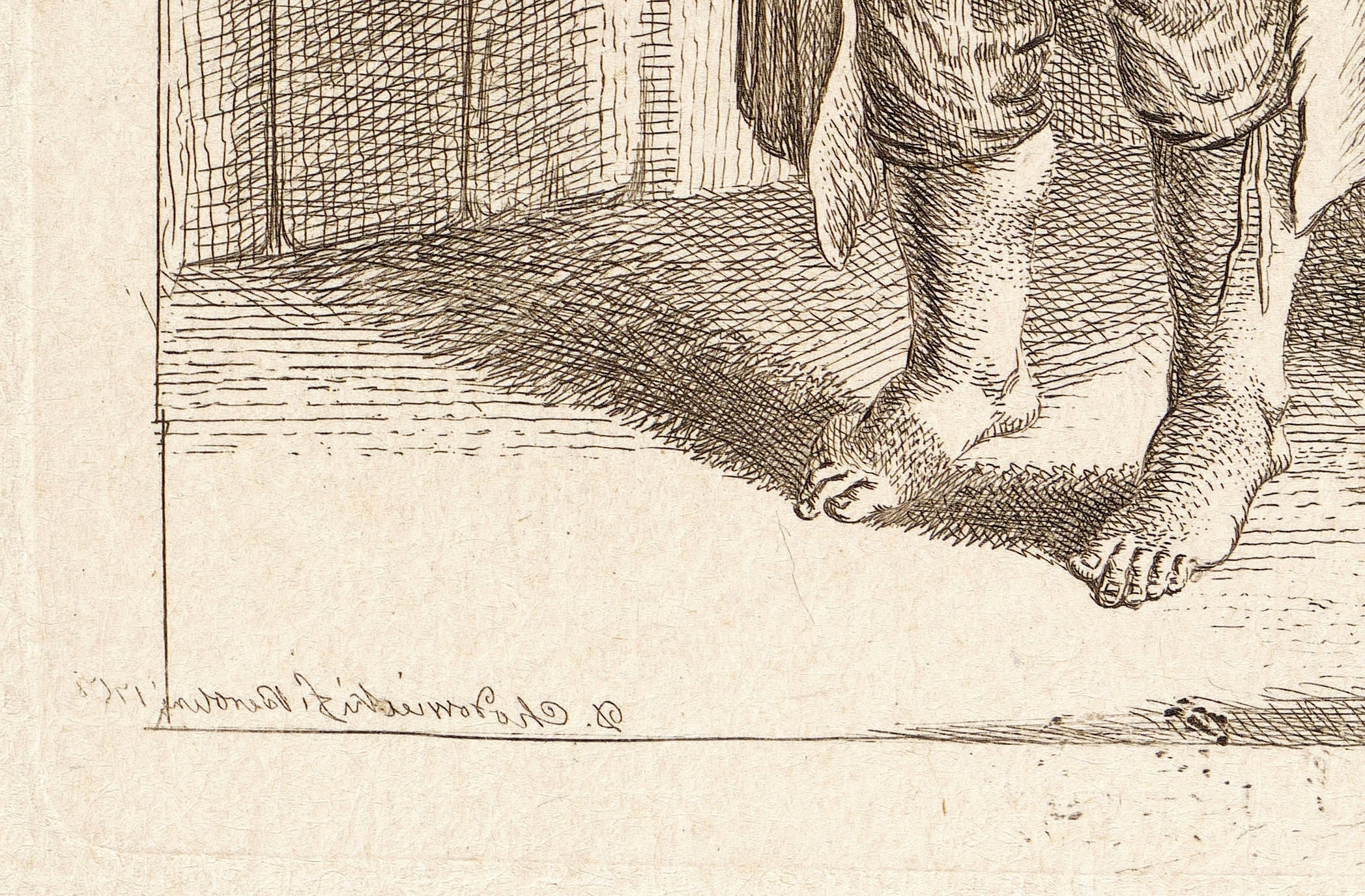 Bauer 10. Engelmann 8. – In der Platte links unten spiegelschriftlich signiert und datiert: ″D. Chodowiecki f. Berolini 1758″. Unter der Platte in brauner Feder Nr. ″8″. – Diesen Bettlerjungen hat Chodowiecki nach eigener Auskunft im Berliner Tiergarten angetroffen. Für ein geringes Entgelt stand er ihm Modell. Besonders hob er den sonderbar vorstehenden Bauchnabel des Jungen hervor, der durch ein Loch im Hemd zu sehen ist. – Keine Mängel ersichtlich. Sauber und frisch wirkend. Sehr guter Zustand.
