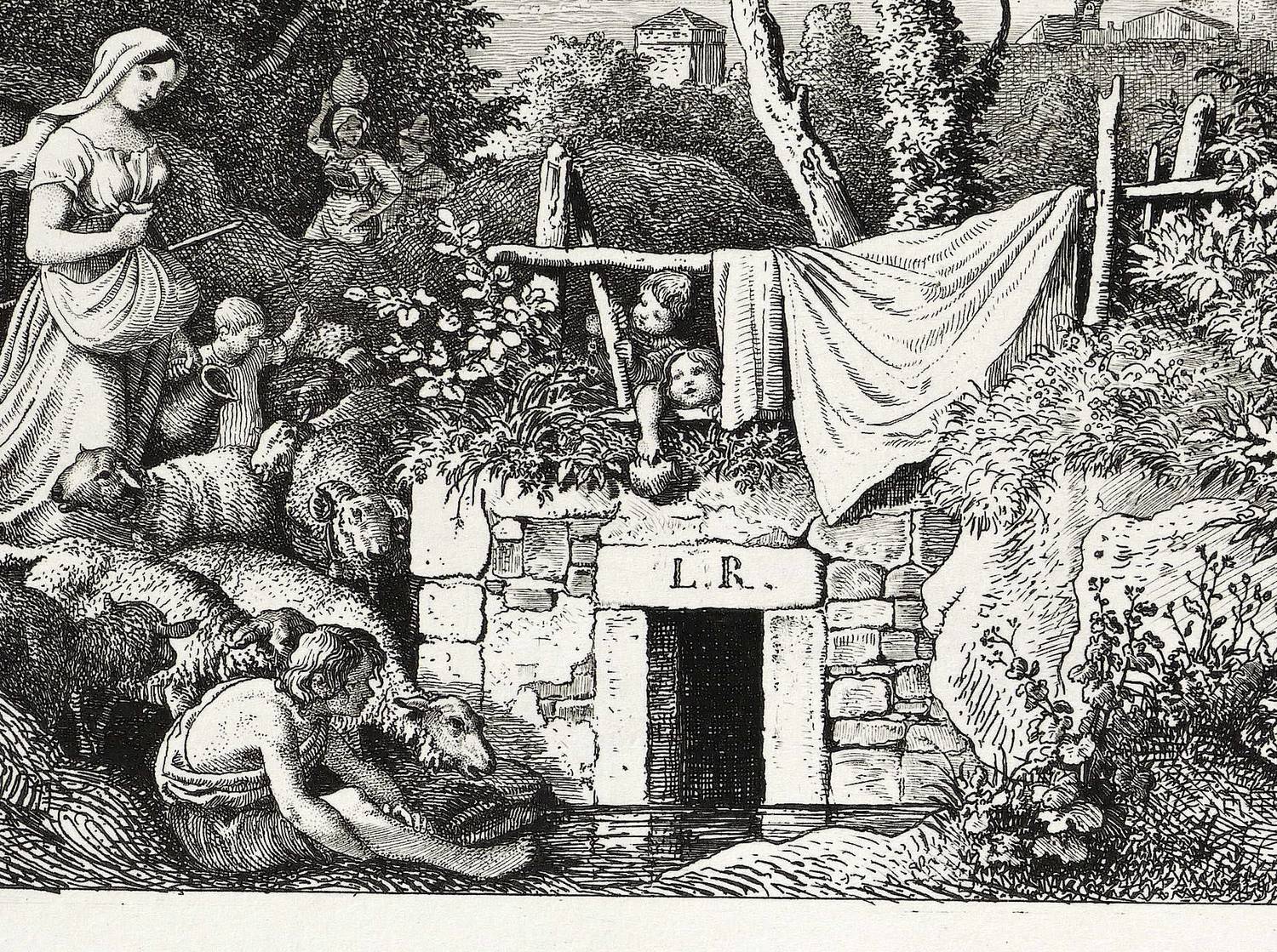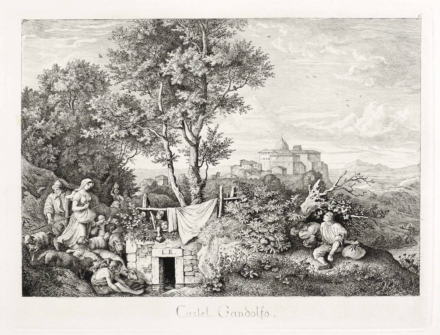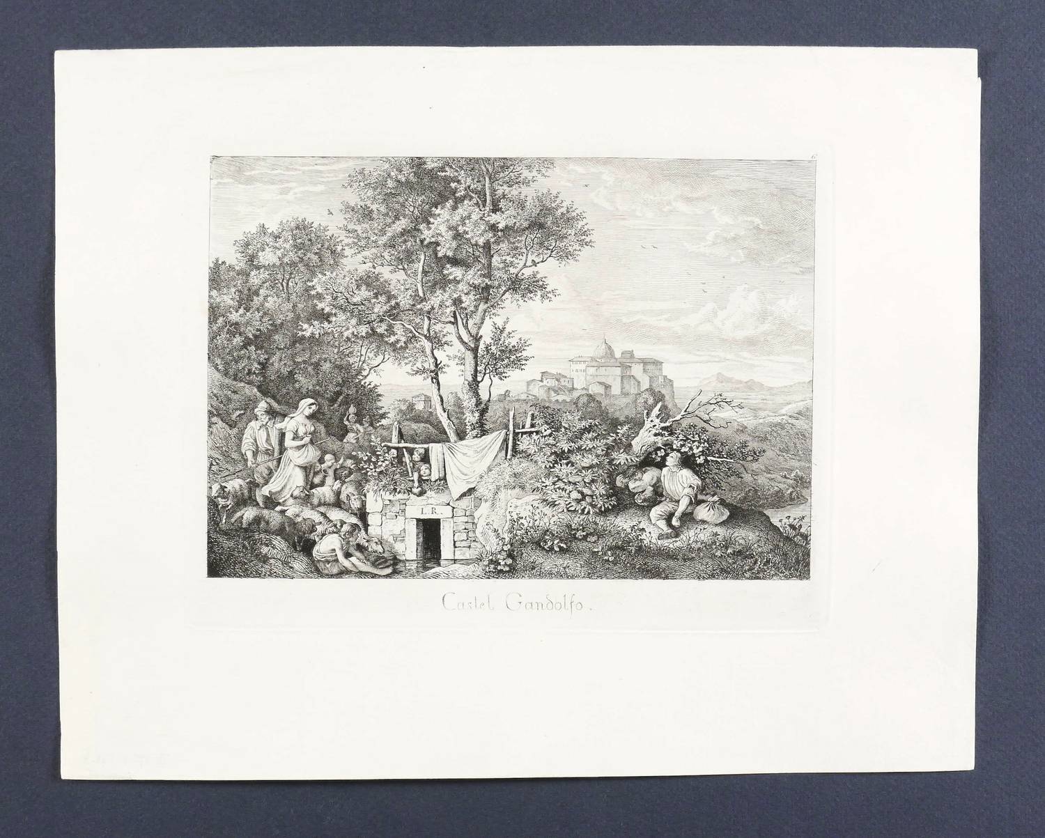 Hoff-Budde 215 IV (von IV). Hoff 176. – Aus: Radierungen von Ludwig Richter II. Heft. VI. Bll. Malerische Ansichten aus den Umgebungen von Rom (Leipzig: C. G. Börner 1832). – In der Platte über dem Brunnen monogrammiert: ″L.R.″ Unten links in der Platte Trockenstempel des Leipziger Verlegers C.G. Börner. Unten mittig Titel. Rechts oben nummeriert: ″6″. – Schön erhalten. Guter Erhaltungszustand.
