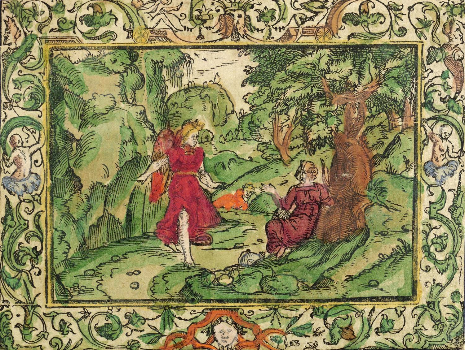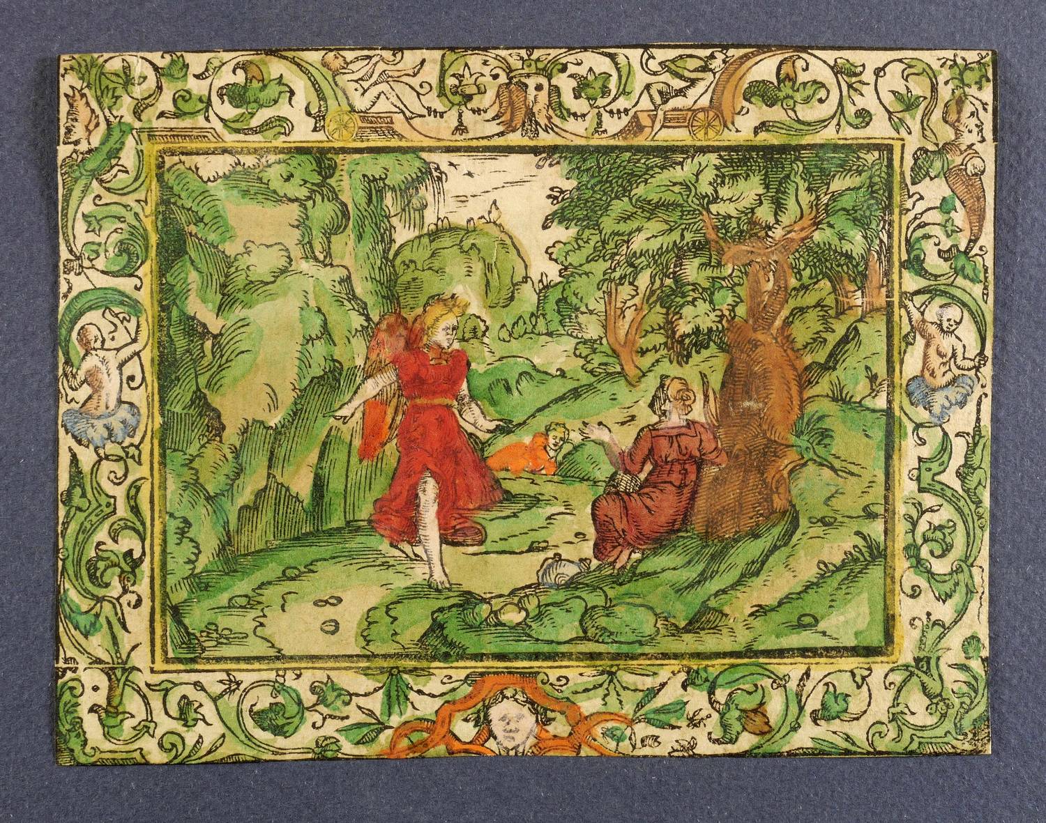 1560-1580. Holzschnitt, alt koloriert. – Historische Buchillustration, von Monogrammist MT. – 7,7 x 11,1 cm (Darstellung / ohne Schmuckrahmen), 10,8 x 14,2 cm (Blatt).