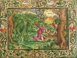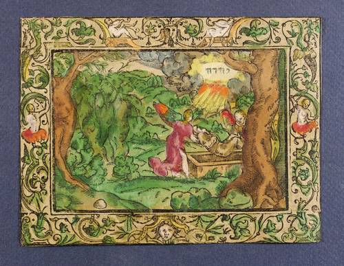 Verso typografischer Rückentext aus der Biblia deutsch von Martin Luther. – Zeittypische Bordüre mit Rollwerk, Putten und zwei weiblichen Genien. - Aus einer deutschen Ausgabe der Lutherbibel der 2. Hälfte des 16. Jahrhunderts. Sämtliche Holzschnitte wohl von einer Hand, oft Bilderfindungen des Virgil Solis folgend, bisweilen mit Monogramm MT und Messerchen signiert. – Bis auf den Rand der Schmuckrahmung beschnitten. Papier altersbedingt etwas gebräunt. Insgesamt gut erhalten.