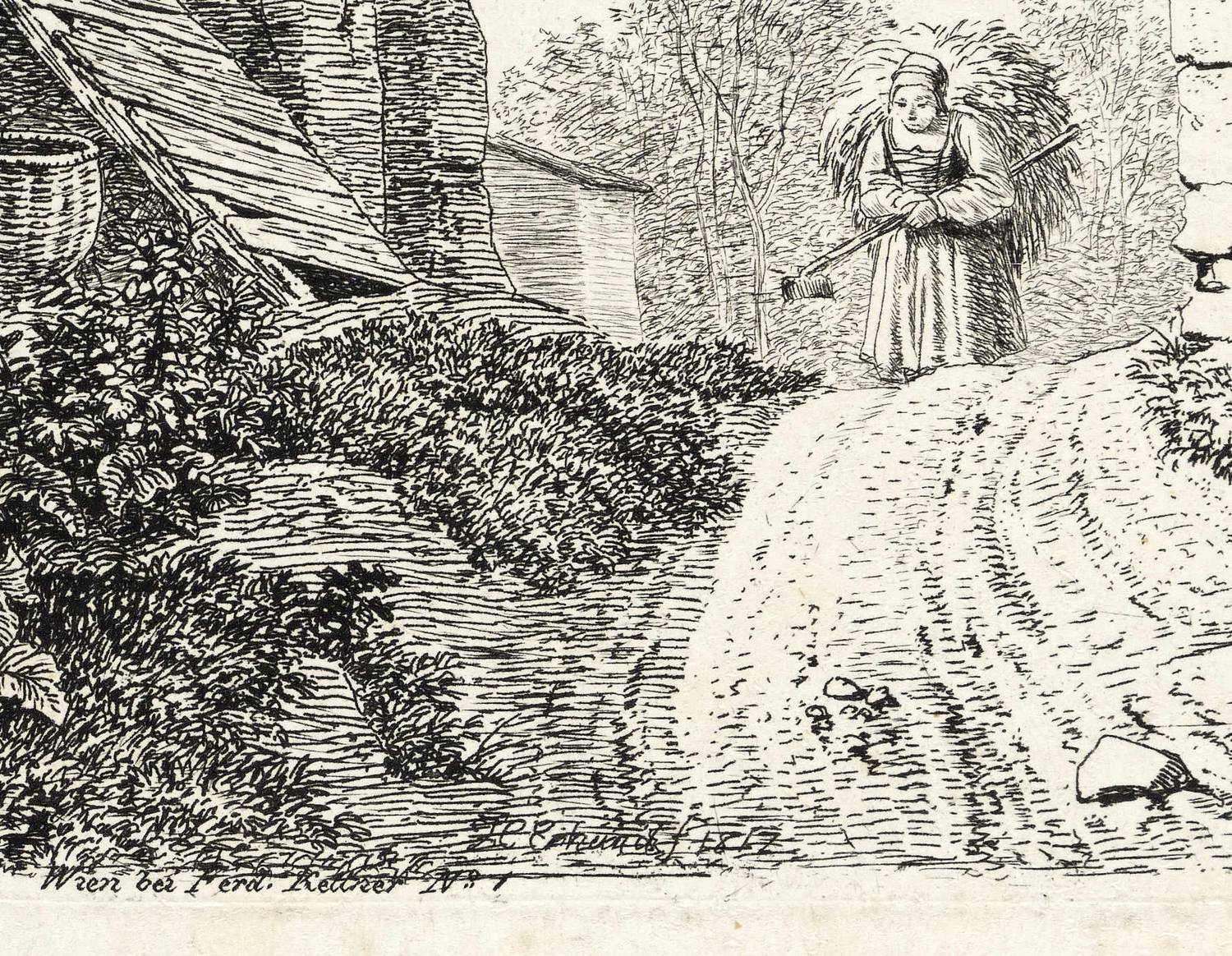 Apell 57 IV (von V). – In der Platte am unteren Rand im Schatten signiert und datiert: "J.C. Erhard f. 1817". Links darunter Verlegeradresse von Ferdinand Kettner in Wien. – Zustand vor der Löschung der Adresse. – Breitrandiges Exemplar. Papier mit leichten Altersspuren, gering fleckig. Verso reversible Montagespuren. Insgesamt guter Erhaltungszustand.
