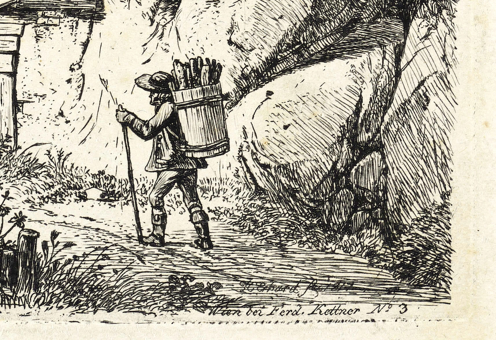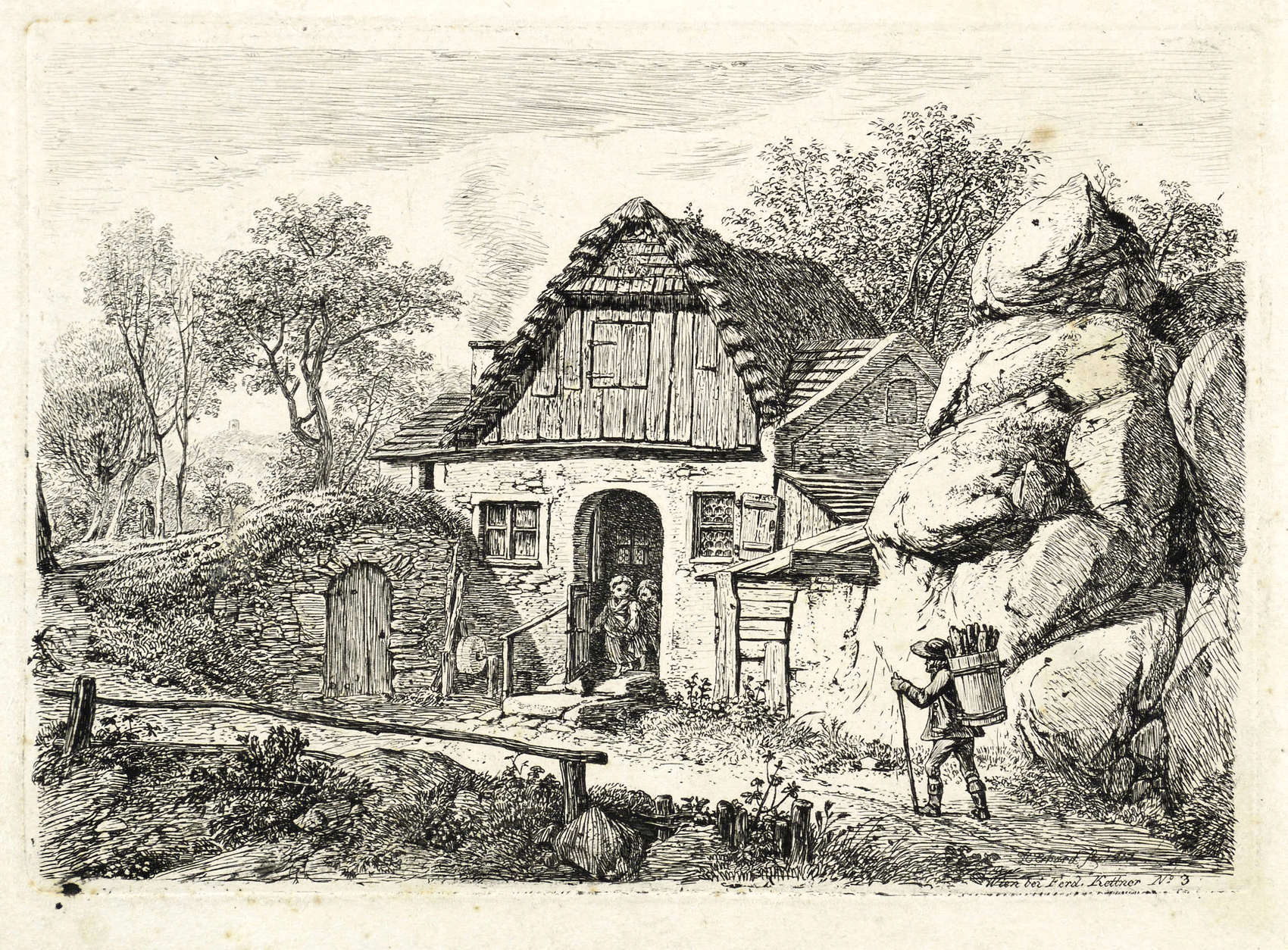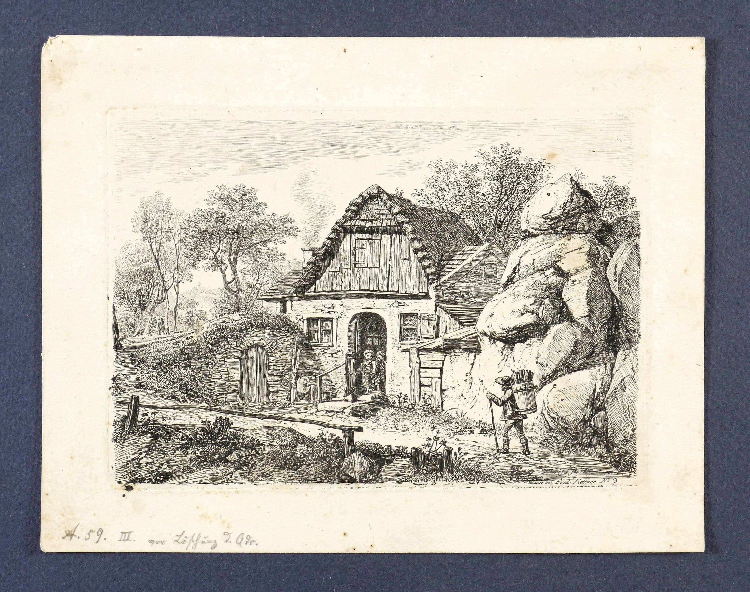 Apell 59 III (von IV). – In der Platte rechts unten im Schatten hinter dem Holzsammler signiert und datiert: "J.C. Erhard fec 1817". Links darunter Verlegeradresse von Ferdinand Kettner in Wien. – Zustand vor der Löschung der Adresse. – Breitrandiges Exemplar. Papier mit Altersspuren, gering fleckig. Verso diverse reversible Montagespuren. Insgesamt guter Erhaltungszustand.
