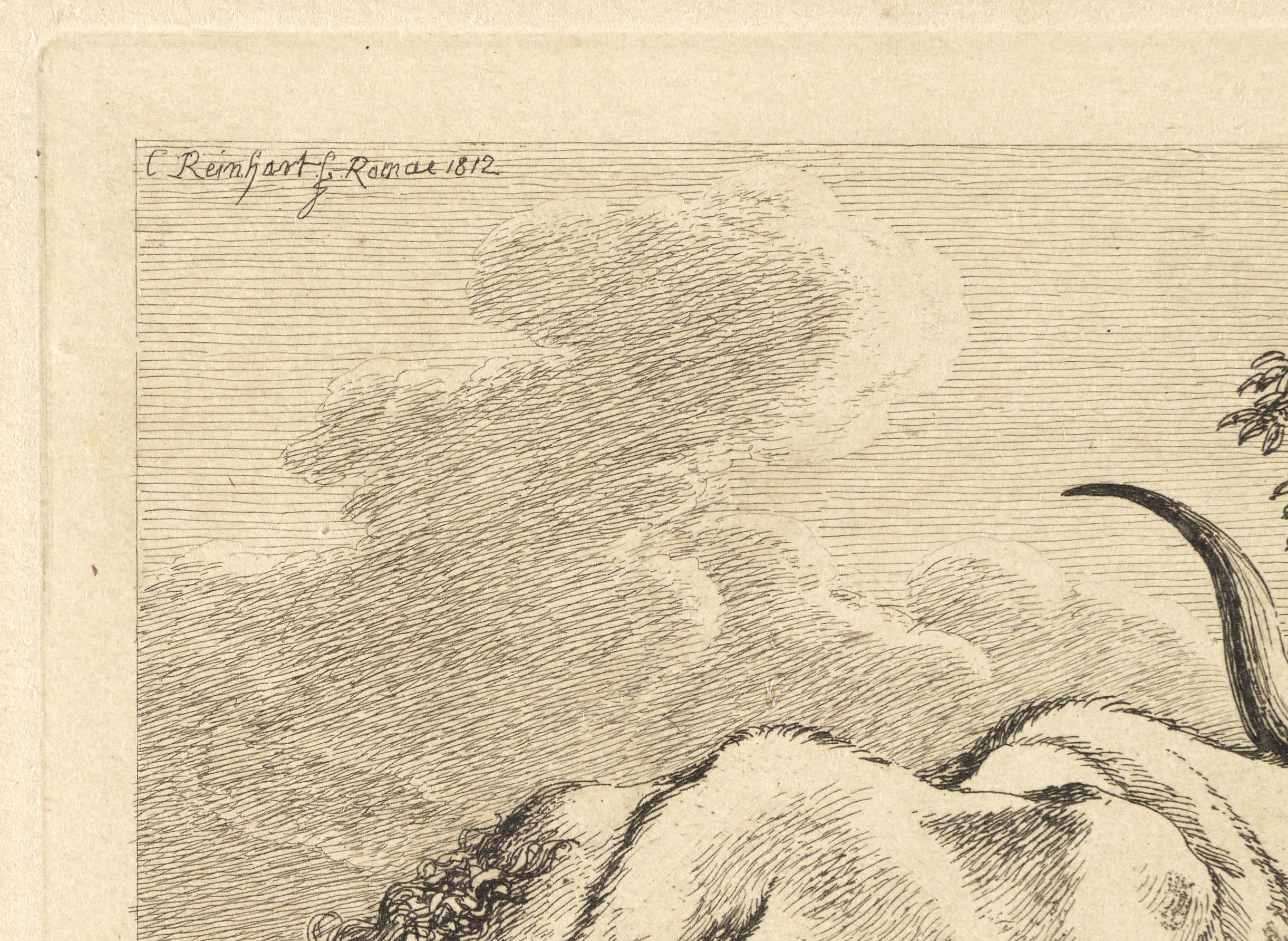 Andresen 132. – In der Platte links oben gestochene Signatur: "C. Reinhart f. Romae 1812". Verso zwei Sammlerstempel, "Dr. R.K." im Kreis und Initial EK im Kreis. – Papier gering fleckig und knickspurig. Verso diverse Montagespuren. Noch guter Zustand.
