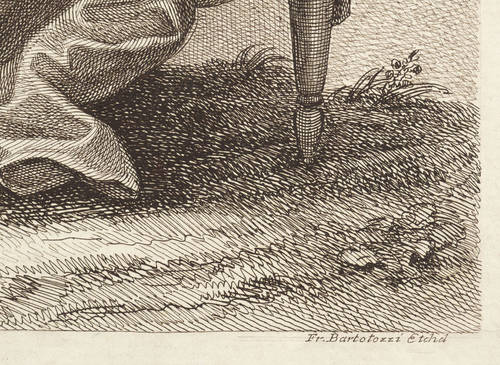 Francesco Bartolozzi (1728 Florenz - 1813 Lissabon). Italienischer Kupferstecher, Zeichner und Kunstverleger. Erlernte die Malerei bei Giovanni Domenico Ferretti in Florenz. Ging nach Venedig, wo er von 1745-51 als Kupferstecher in der Werkstatt von Joseph Wagner arbeitete. Ging 1756 weiter nach Rom und kehrte 1760 nach Venedig zurück. Wurde 1764 nach London berufen. Es folgte die Ernennung zum Engraver of the King durch König George III. 1768 Gründungsmitglied der Royal Academy of Arts. Entwickelte in London ein spezielles Punktstichverfahren, das eine nuancenreiche Wiedergabe von Schattierungen im Mehrfarbendruck ermöglichte. 1802 Berufung zum Direktor der Nationalakademie in Lissabon, welches Amt er bis kurz vor seinem Tode ausübte.