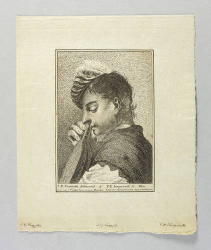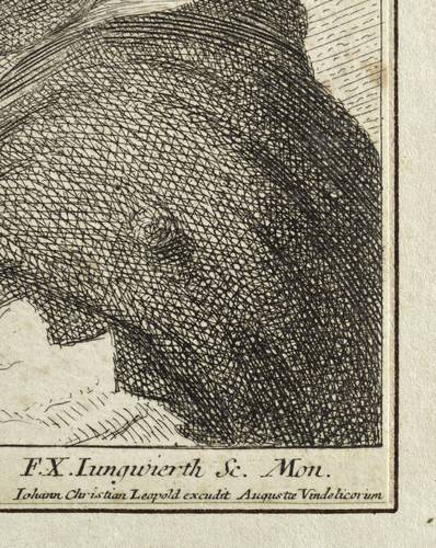 In der Platte unten gestochene Signatur: ″F.X. Iungwierth Sc. Mon.″ Darunter kaiserliches Privileg sowie Verlegeradresse von Johann Christian Leopold in Augsburg. Auf dem Trägerpapier in schwarzer Feder bezeichnet: ″J.B. Piazzetta / J.C. Leopold. / F.X. Jungwierth.″ – Aus einer thüringischen Grafik-Sammlung des frühen 19. Jahrhundert. – Um Darstellung und Schrift beschnitten. Alt auf Trägerbüttenpapier (1824-54, Papiermühle Christian Friedrich Hempel in Stadtroda) gesetzt. Insgesamt guter Zustand.