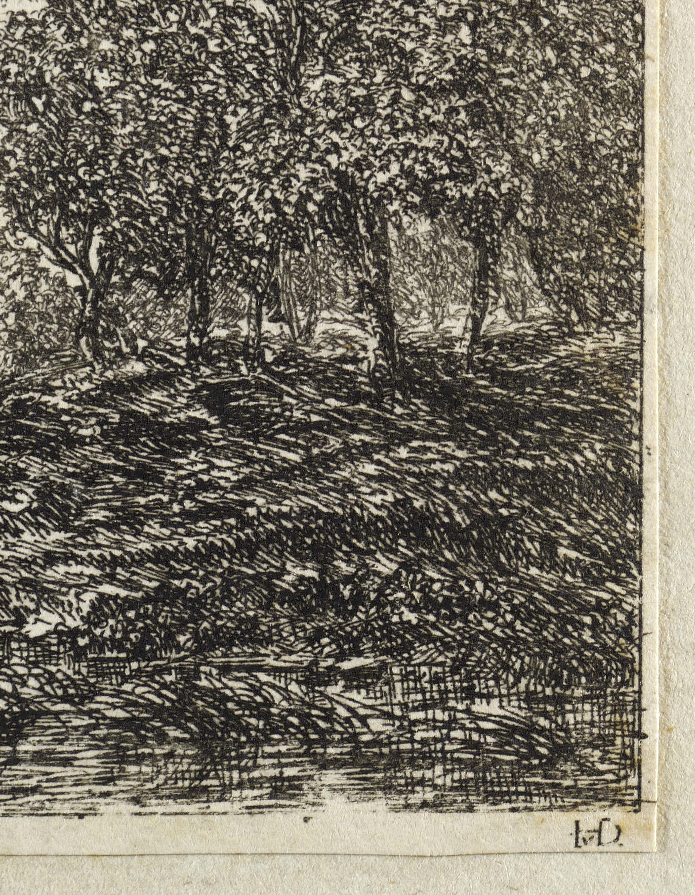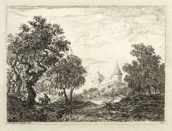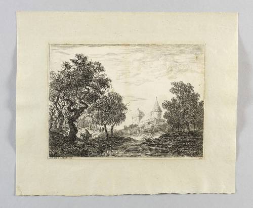 Aus: Christian Ludwig von Hagedorn, Landschaften und Köpfe in Kupfer geätzet (1745). – In der Platte links unter der Darstellung bezeichnet ″No. 69. d. 14. Novemb. 1744.″ Rechts monogrammiert ″HvD.″ – Aus einer thüringischen Grafik-Sammlung des frühen 19. Jahrhundert. – Mit schmalem Rändchen um die Darstellung. In der Platte beschnitten. Alt auf Trägerbüttenpapier (1824-54, Papiermühle Christian Friedrich Hempel in Stadtroda) gesetzt. Insgesamt guter Zustand.