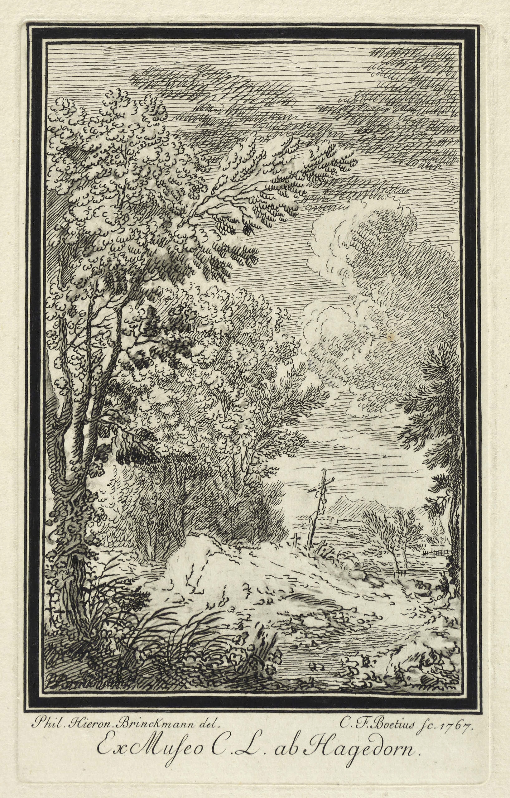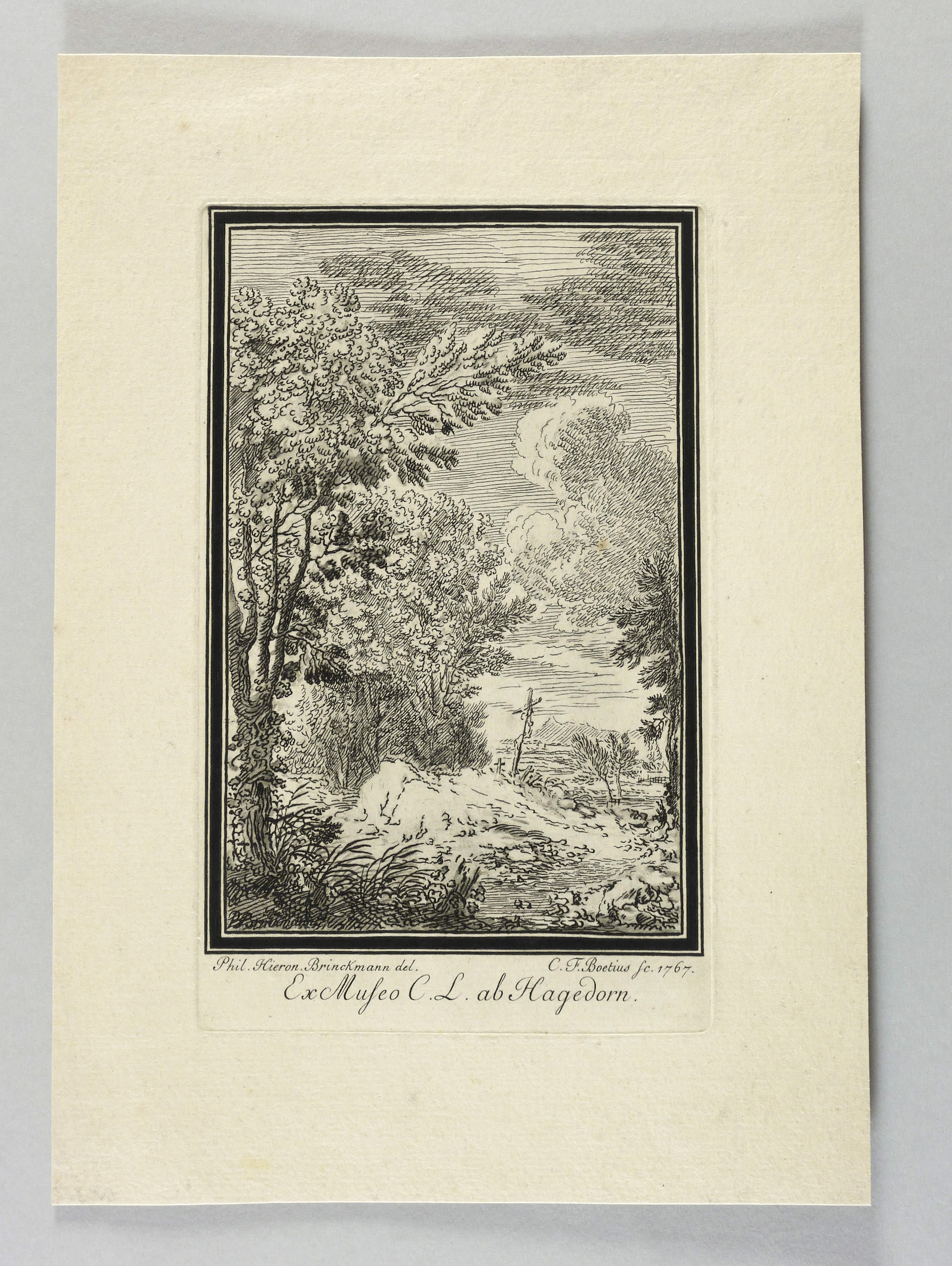 In der Platte rechts unterhalb der Darstellung signiert: ″C.F. Boetius sc. 1767″. Mittig bezeichnet: ″Ex Museo C.L. ab Hagedorn.″ – Breiter Rand um die Platte. Keine Mängel. Sehr guter Zustand.