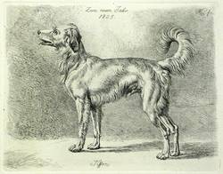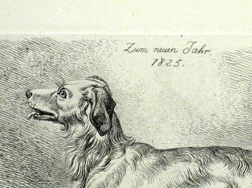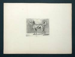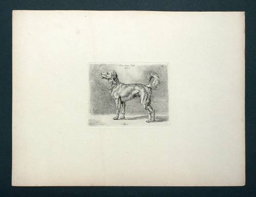 Jahn 273 II (von II). – In der Platte signiert, datiert und betitelt. Verso Sammlerstempel mit Monogramm EK im Kreis. – Bei Jahn beschrieben als: ″langhaariger Hund mit halbgeöffnetem Rachen und hochgetragener Ruthe im Profil nachn links stehend.″ – Verso Reste einer ehemaligen Montierung. Durchgehend leicht gedunkelt. Dem Alter entsprechend guter Erhaltungszustand.