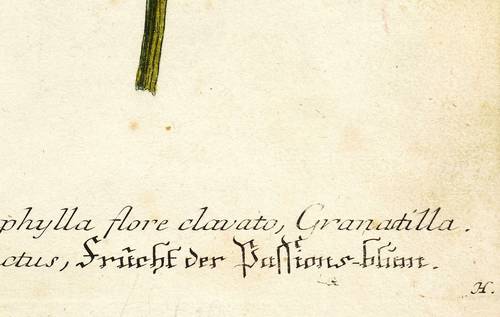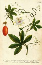 Aus: Johann Wilhelm Weinmann, Phytanthoza-Iconographia Oder Eigentliche Vorstellung Etlicher Tausend, So wohl Einheimisch- als Ausländischer, aus allen vier Welt-Theilen, in Verlauf vieler Jahre (...) gesammelter Pflantzen, Bäume, Stauden, Kräuter, Blumen, Früchten und Schwämme (Regensburg: Hieronymus Lentz 1737-1745), Bd. 2 (1739). – In der Platte rechts unten Signatur, rechts oben Tafel-Nr. "395", unten mittig ausführliche Inschrift: "a. Clematis passionalis pentaphylla flore clavato, Granatilla. b. Clematis passiflorae fructus, Frucht der Passions-blum." – Bei der dargestellten Pflanze handelt es sich um Passiflora caerulea L., die Blaue Passionsblume. Der Name hat seinen Ursprung darin, dass man meinte, in der Blüte die Symbole der Passion Christi wiederzuerkennen. - Bei der Herstellung der Tafeln arbeiteten die Augsburger Künstler Bartholomäus Seutter, Johann Jakob Haid und Johann Elias Ridinger zusammen. Die Kupfer wurden in einer für die Zeit revolutionären Weise farbig gedruckt und sodann partiell von Hand koloriert. Dabei fand der von Seutter weiterentwickelte Mezzotinto-Farbdruck des Niederländers Johannes Teyler Anwendung. – Das kräftige Büttenpapier leicht stockleckig und im Rand angeschmutzt. Das Kolorit kontrastreich erhalten. Dem Alter entsprechend guter Zustand.