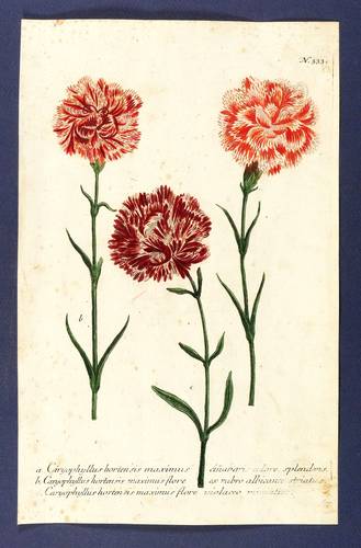 Aus: Johann Wilhelm Weinmann, Phytanthoza-Iconographia Oder Eigentliche Vorstellung Etlicher Tausend, So wohl Einheimisch- als Ausländischer, aus allen vier Welt-Theilen, in Verlauf vieler Jahre (...) gesammelter Pflantzen, Bäume, Stauden, Kräuter, Blumen, Früchten und Schwämme (Regensburg: Hieronymus Lentz 1737-1745), Bd. 2 (1739). – In der Platte rechts unten Signatur, rechts oben Tafel-Nr. "333", unten mittig ausführliche Inschrift: "a. Caryophyllus hortensis maximus cin[n]abaris splendens. b. Caryophyllus hortensis maximus flore ex rubro albicante striatus. c. Caryophyllos hortensis maximus flore violaceo miniatus." – Die dargestellte Gartennelke ist die kultivierte Form der Edel- oder Landnelke (Dianthus caryophyllus L.). - Bei der Herstellung der Tafeln arbeiteten die Augsburger Künstler Bartholomäus Seutter, Johann Jakob Haid und Johann Elias Ridinger zusammen. Die Kupfer wurden in einer für die Zeit revolutionären Weise farbig gedruckt und sodann partiell von Hand koloriert. Dabei fand der von Seutter weiterentwickelte Mezzotinto-Farbdruck des Niederländers Johannes Teyler Anwendung. – Das kräftige Büttenpapier ist partiell etwas stärker stockfleckig. Das Kolorit ist kontrastreich und wohlerhalten. Insgesamt dem Alter entsprechend noch guter bis mäßiger Zustand.