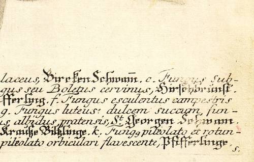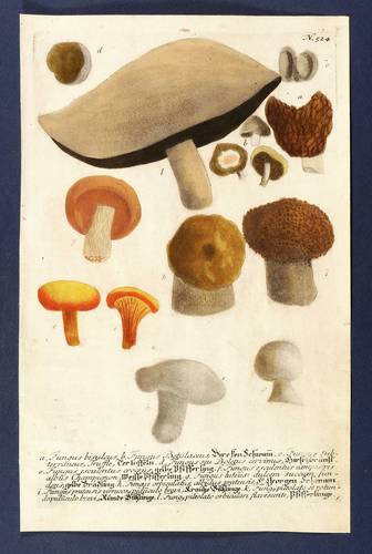 Aus: Johann Wilhelm Weinmann, Phytanthoza-Iconographia Oder Eigentliche Vorstellung Etlicher Tausend, So wohl Einheimisch- als Ausländischer, aus allen vier Welt-Theilen, in Verlauf vieler Jahre (...) gesammelter Pflantzen, Bäume, Stauden, Kräuter, Blumen, Früchten und Schwämme (Regensburg: Hieronymus Lentz 1737-1745), Bd. 2 (1739). – In der Platte rechts unten Signatur. Rechts oben Tafel-Nr. "524". Unten ausführliche Inschrift: "a. Fungus bisculeus. b. Fungus Betulaceus, Bircken Schwam[m]. c. Fungus subterraneus, Truffle, Tertoffeln. d. Fungus seu Boletus cervinus, Hirschbrunst. e. Fungus esculentus croceus, gelbe Pfifferling. f. Fungus esculentus campestris albus Champignon, Weisse Pfifferling. g. Fungus luteus dulcem succum fundens, gelbe Brädling. h. Fungus orbiculatus albidus pratensis, St. Georgen Schwam. i. Fungus pratensis verrucos[us] pedu[n]culo brevi, Krauße Biltzlinge. k. Fung[us] pileolato et rotundo pedu[n]culo brevi, Runde Biltzlinge. l. Fung[us] pileolato orbiculare flavescente, Pfifferlinge." – Bei der Herstellung der Tafeln arbeiteten die Augsburger Künstler Bartholomäus Seutter, Johann Jakob Haid und Johann Elias Ridinger zusammen. Die Kupfer wurden in einer für die Zeit revolutionären Weise farbig gedruckt und sodann partiell von Hand koloriert. Dabei fand der von Seutter weiterentwickelte Mezzotinto-Farbdruck des Niederländers Johannes Teyler Anwendung. – Kontrastreiches wohlerhaltenes Kolorit. Insgesamt guter Erhaltungszustand.