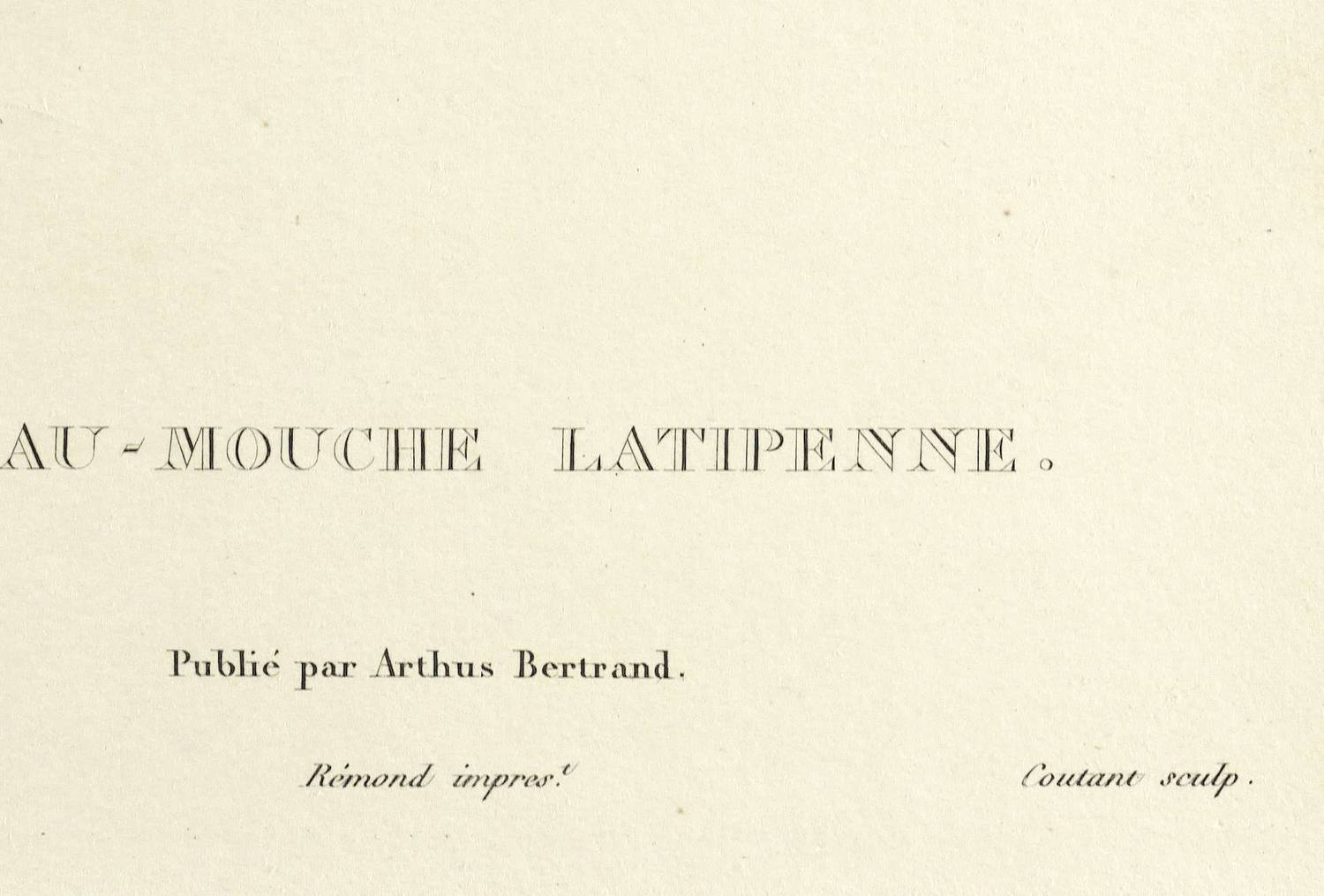 Anker 291. Nissen IVB 547. – Aus: René Primevère Lesson, Histoire naturelle des oiseaux-mouches (Paris: Arthus Bertrand 1829-1830). – In der Platte unten Titel und Verlagsadresse. Darunter signiert: "Prêtre pinx. / Rémond impres.t / Coutant sculp." – Partiell unscheinbar fleckig. Sonst guter Zustand.