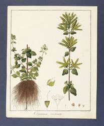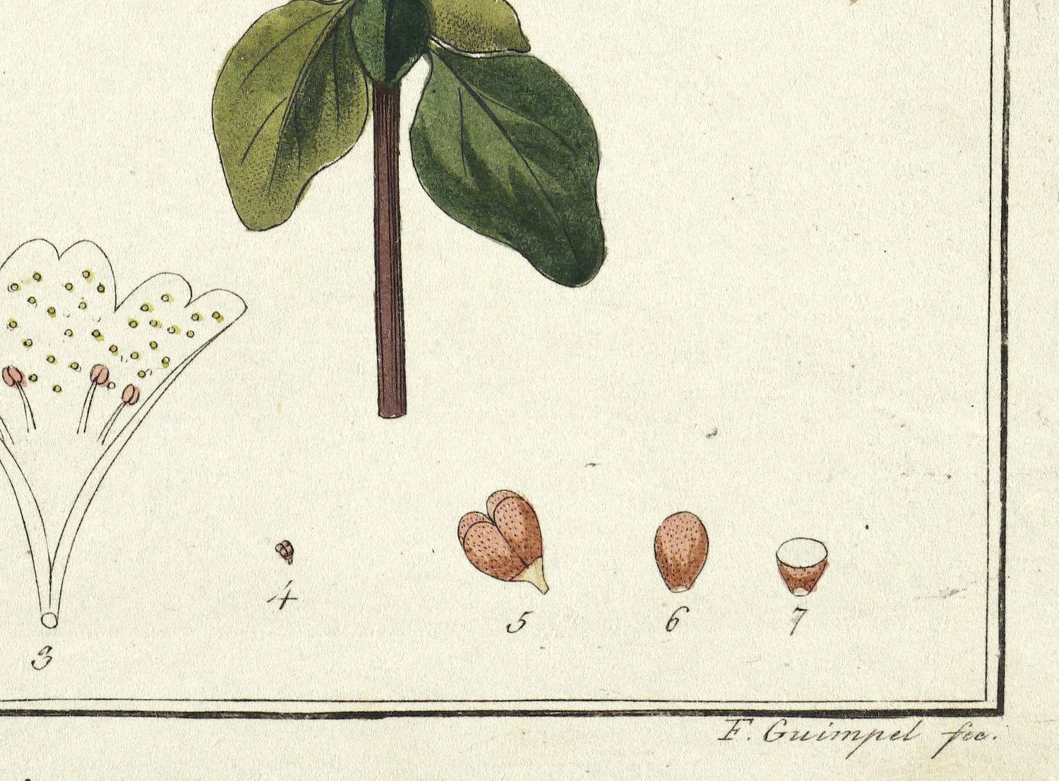 Aus: Friedrich Gottlob Hayne, Getreue Darstellung und Beschreibung der in der Arzneykunde gebräuchlichen Gewächse. wie auch solcher, welche mit ihnen verwechselt werden können (Berlin: Selbstverlag 1805-38), Bd. 1-14. – In der Platte rechts unten signiert: "F. Guimpel fec." Unterhalb der Darstellung betitelt. – Blatt mit weitgehend ausgelegener Knickspur oben links. Sonst guter Erhaltungszustand.