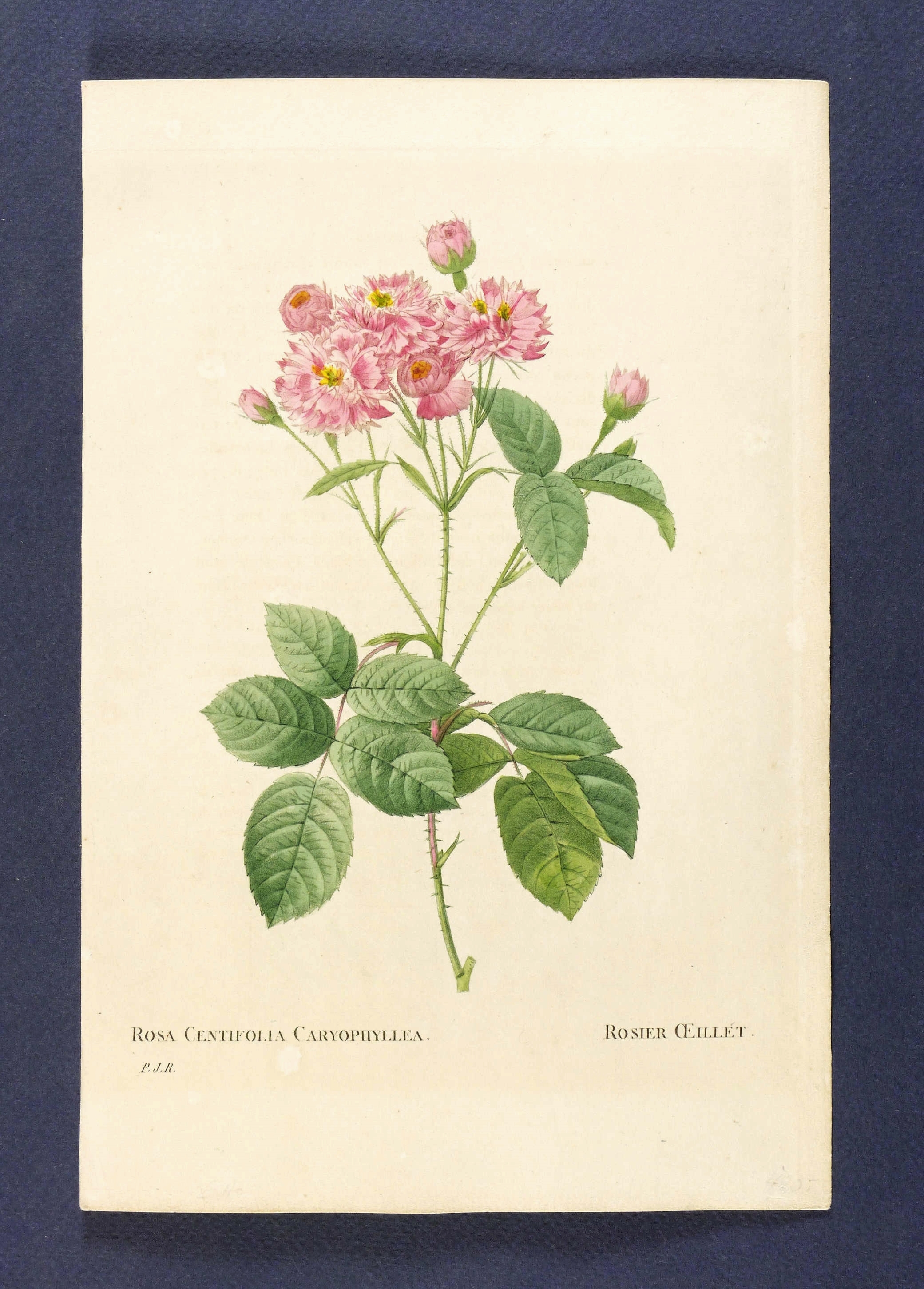 Rosen. – Rosa centifolia. – Redoute. – „Rosa Centifolia Caryophyllea. Rosier Œillét”.