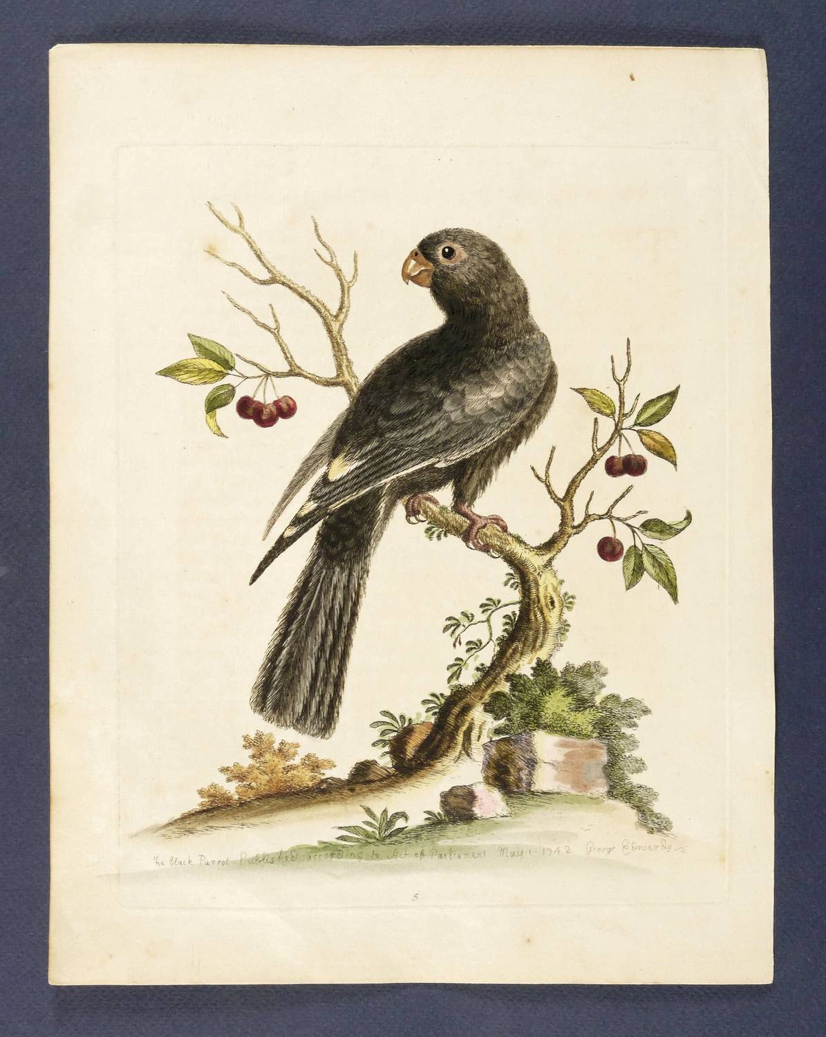 Vögel. - Papageien. – Vasapapagei (Coracopsis). – Edwards. – „The black Parrot”.