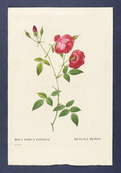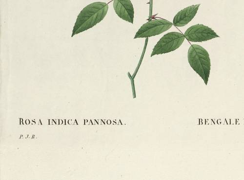 Aus: Pierre-Joseph Redouté, Les Roses (Paris: P. Dufart 1828-35). – In der Platte links unten monogrammiert: "P.J.R." Unterhalb der Darstellung betitelt: "ROSA INDICA PANNOSA. BENGALE BICHON." – Tadellos erhalten. Schönes Kolorit. Sehr guter Zustand.