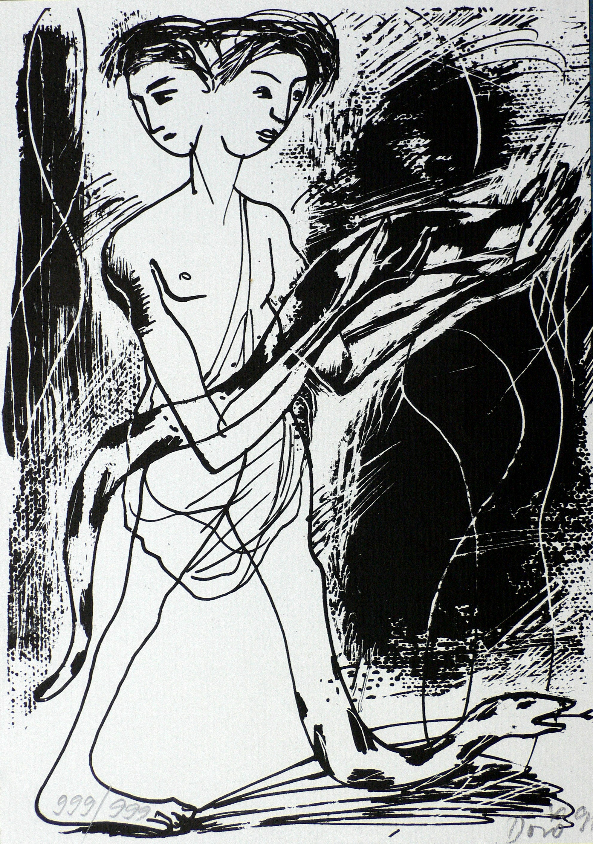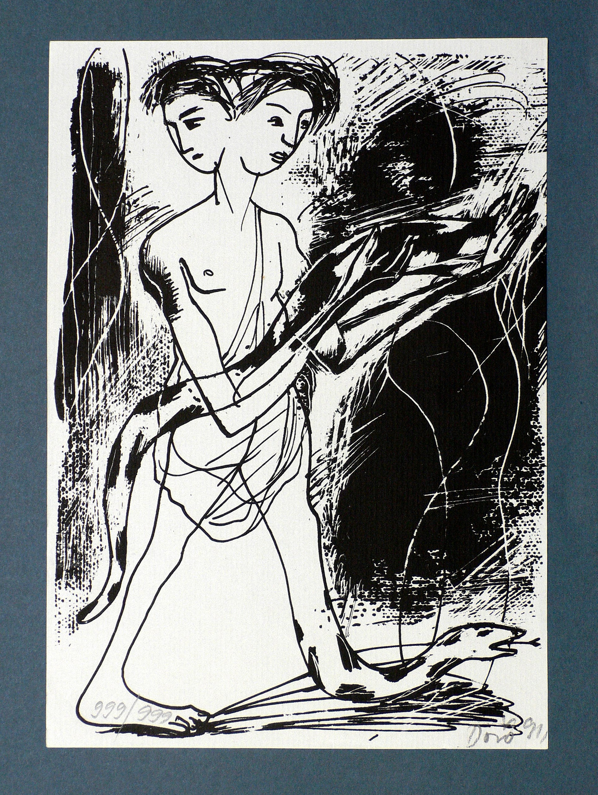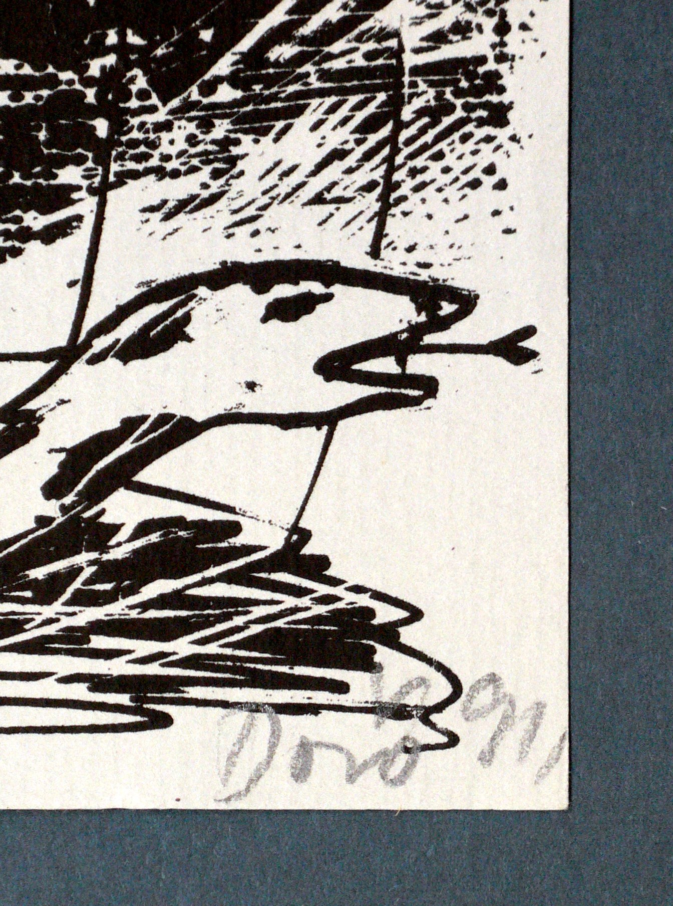 1991. Lithografie / Kreidelithografie, in Schwarz, auf blaugrau getöntem Papier. – Originale Künstlergrafik, von Sándor Dóró. – Auflage Exemplar Nr. 999/999. – 21,0 x 15,0 cm (Darstellung / Einfassungslinie).
