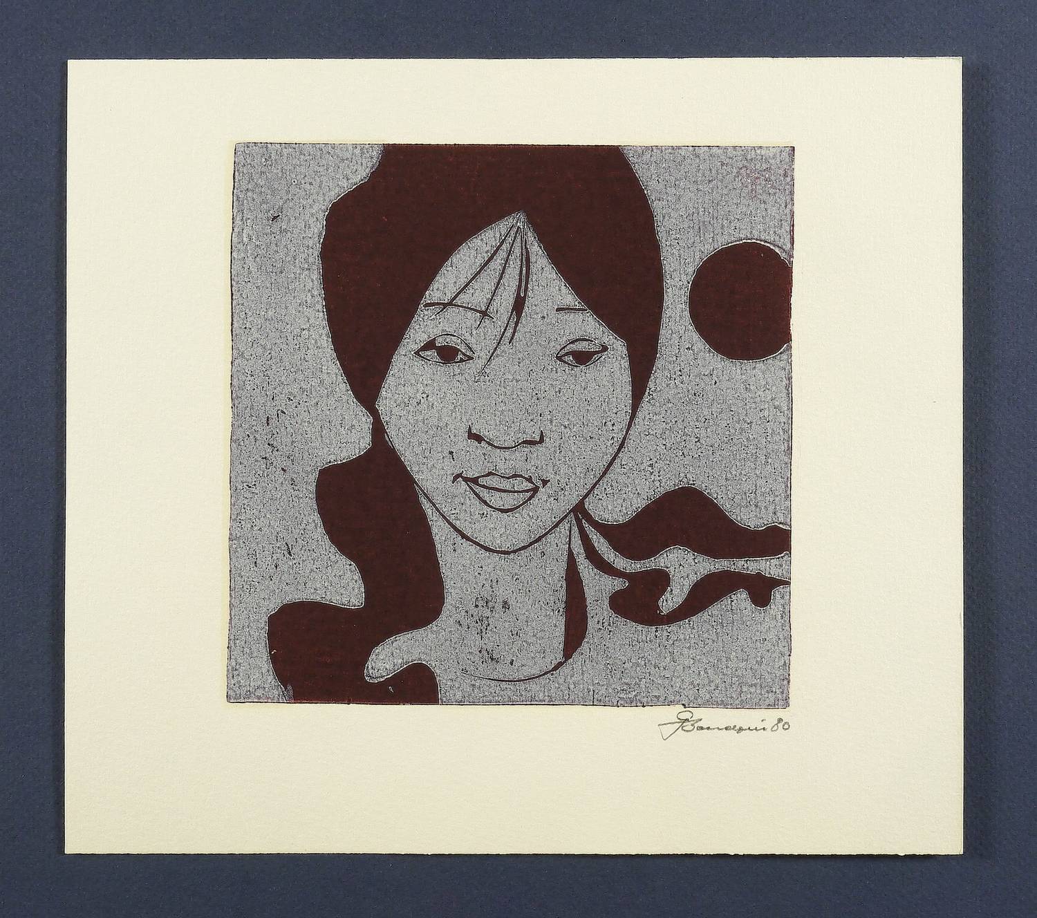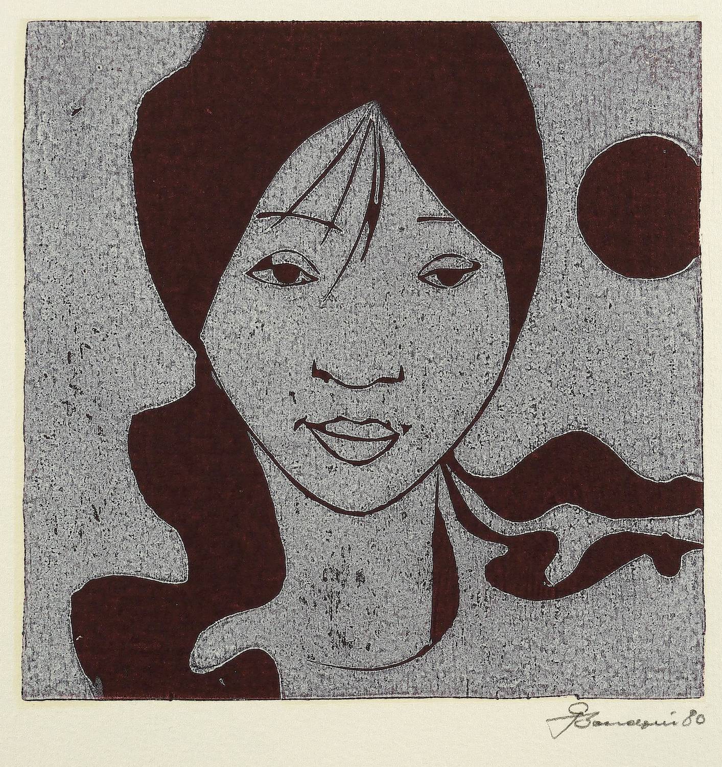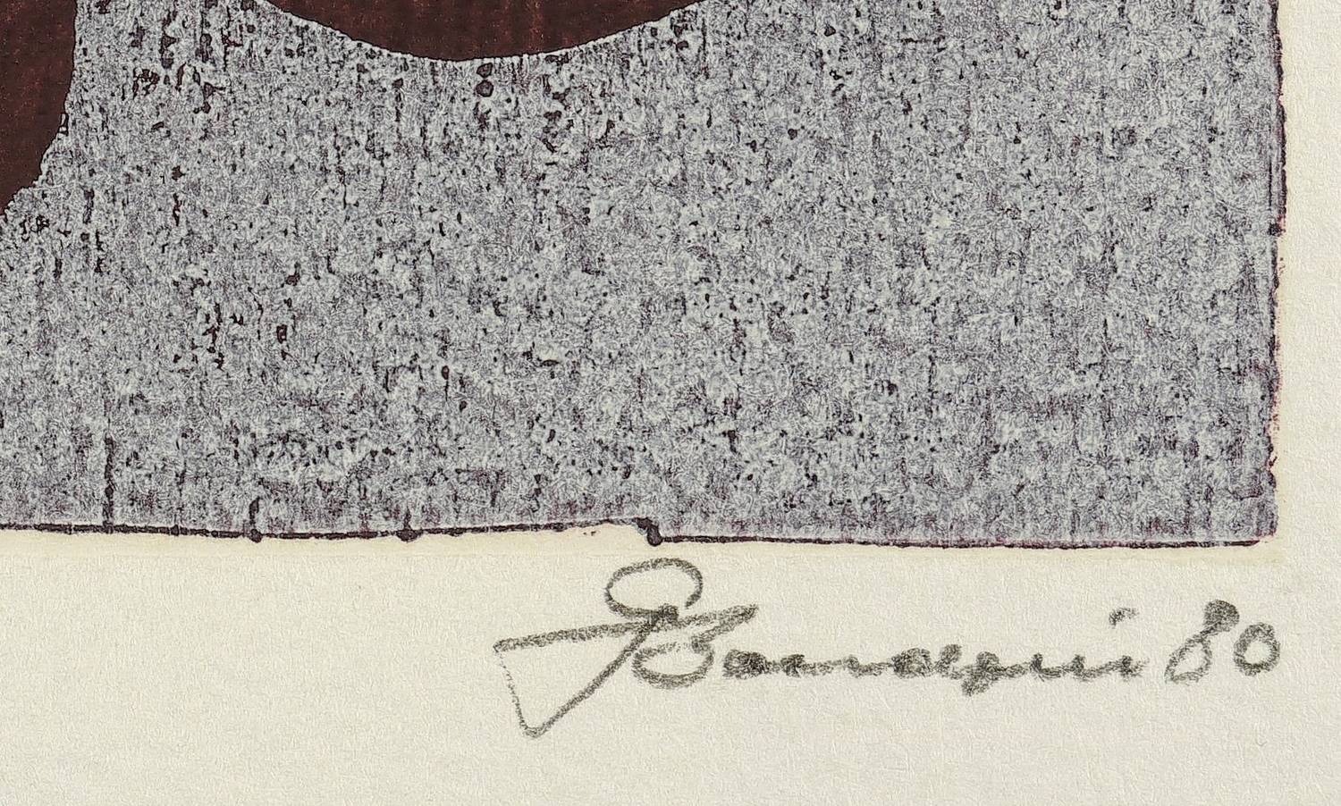 1980. Farblinolschnitt, in Violett & Aubergine, auf Velin. – Originale Künstlergrafik, von Gerhard Bondzin. – 15,0 x 15,0 cm (Darstellung), 21 x 24 cm (Blatt).