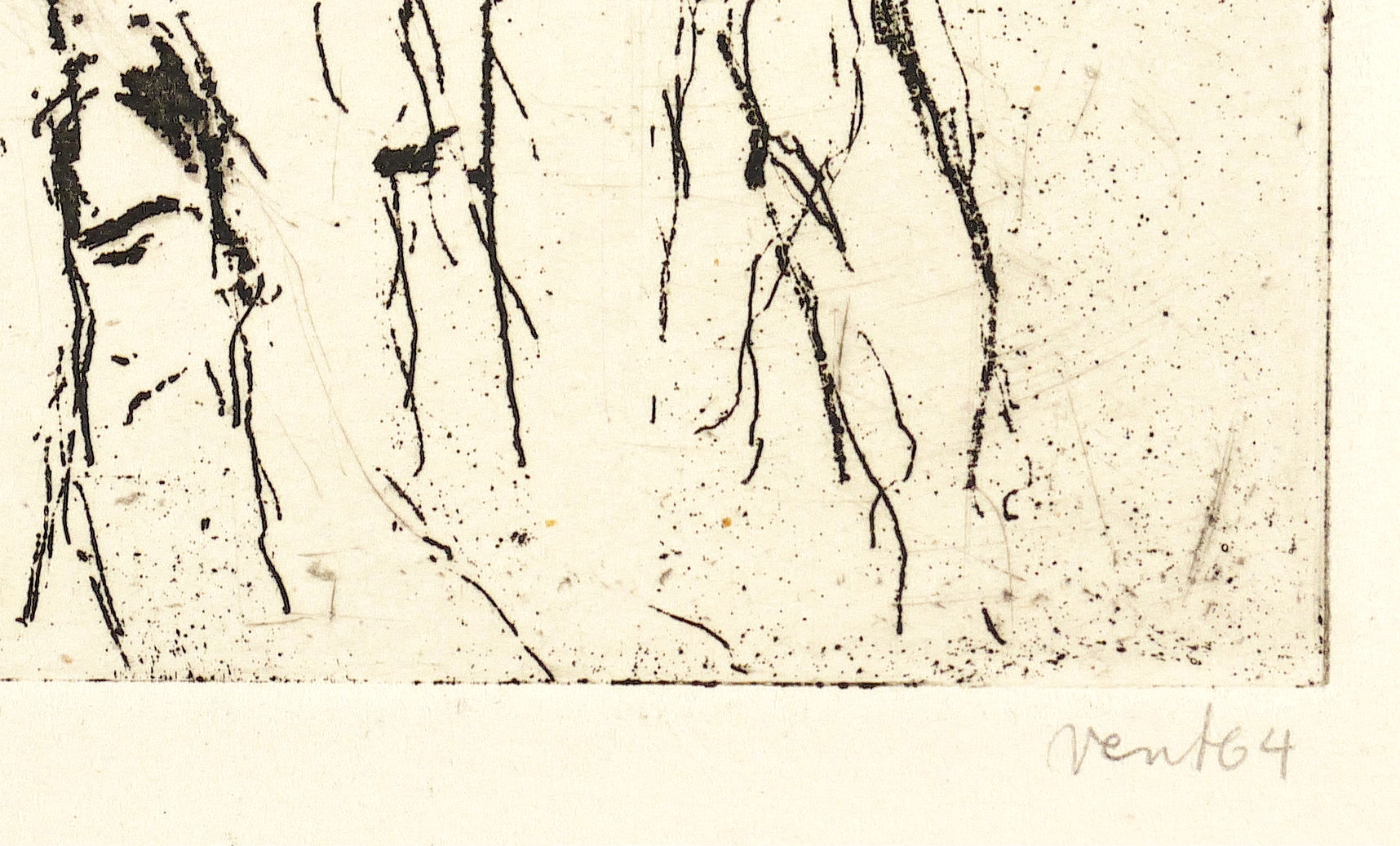 1964. Radierung / Kaltnadel, in Schwarz, auf hellgelbem Bütten. – Originale Künstlergrafik, von Hans Vent. – 9,8 x 17,1 cm (Darstellung / Platte), 19 x 20 cm (Blatt).