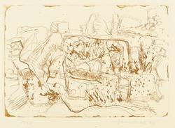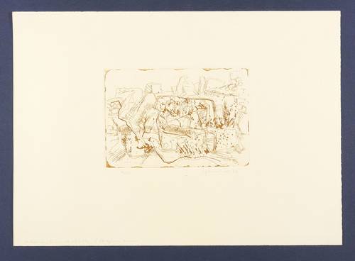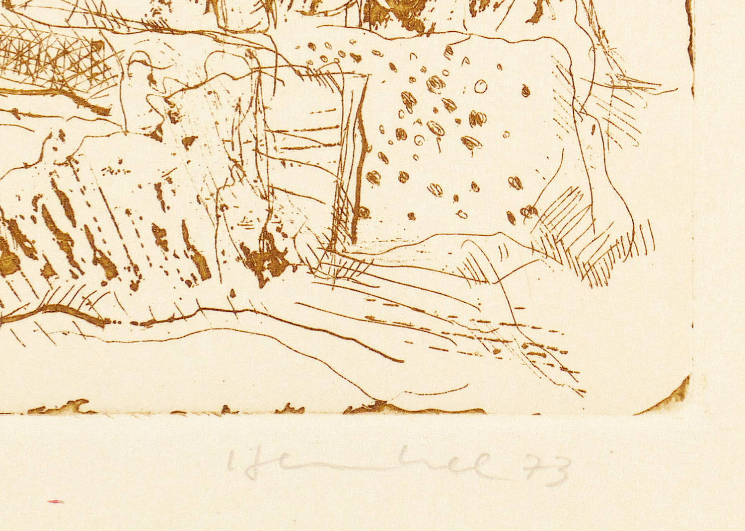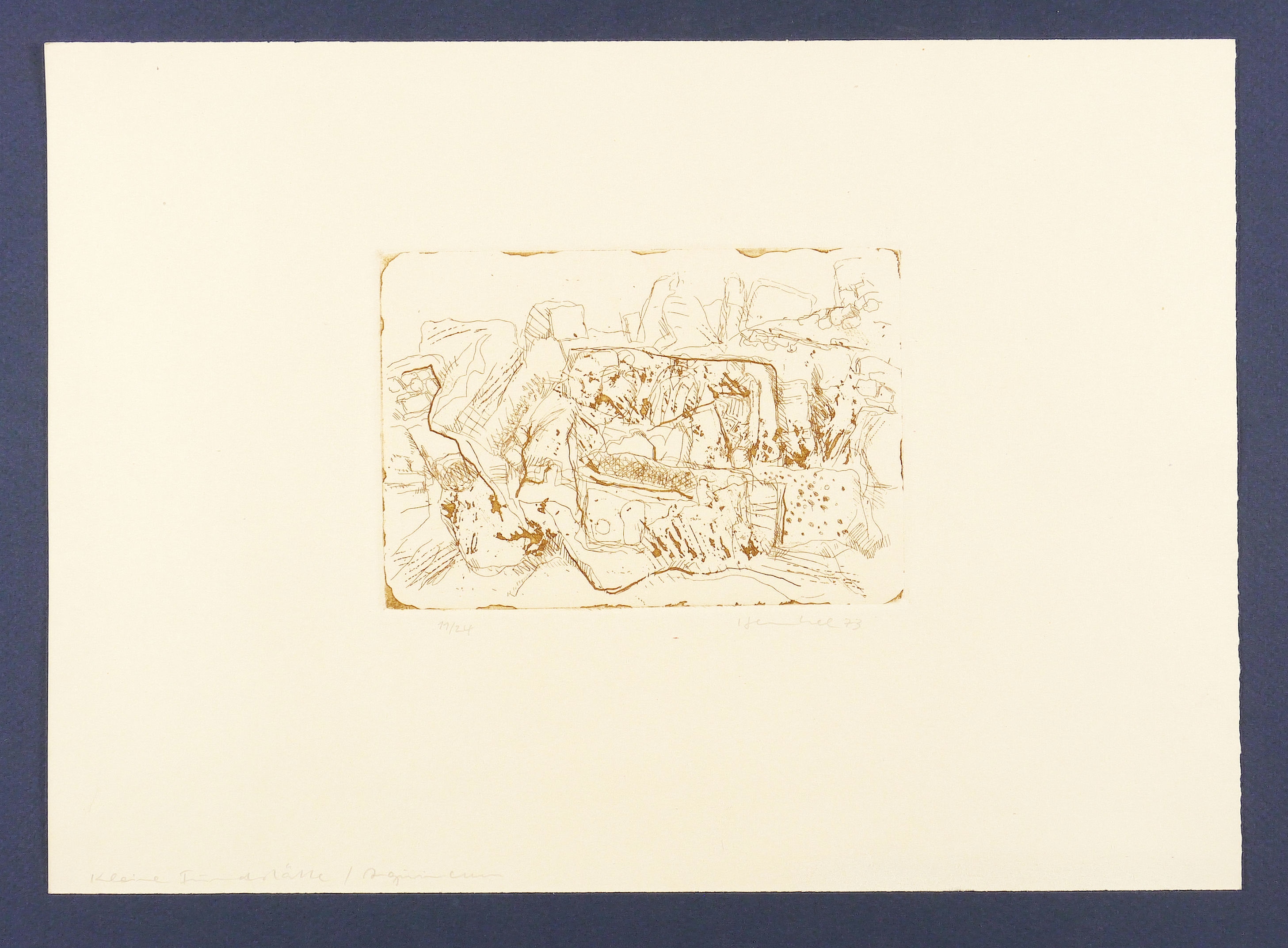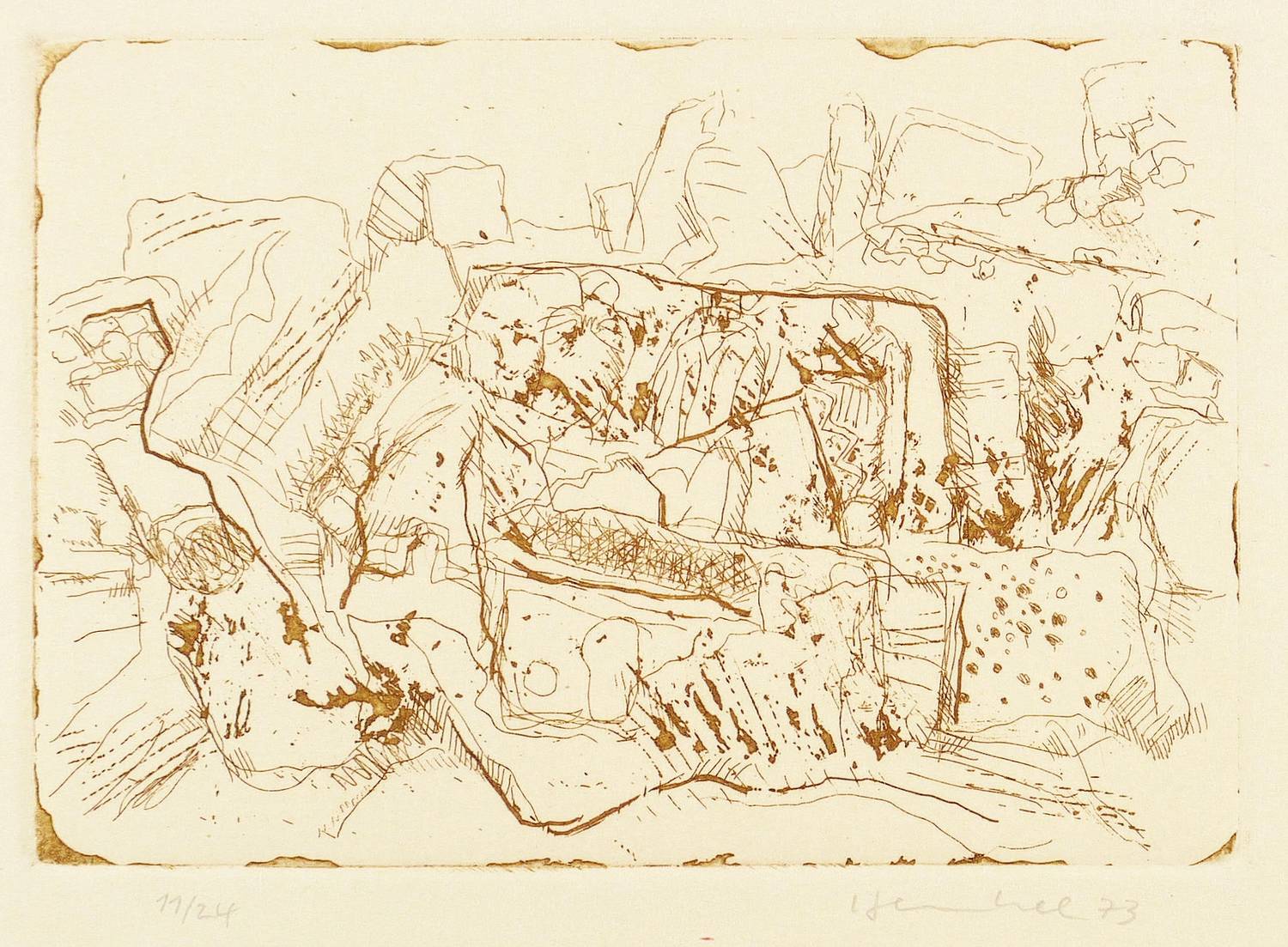 1973. Radierung / Strichätzung & Reservage, in Braun, auf gelblichem Karton. – Originale Künstlergrafik, von Friedrich B. Henkel. – Auflage Exemplar Nr. 11/24. – 10,6 x 15,3 cm (Darstellung / Platte), 25 x 35 cm (Blatt).