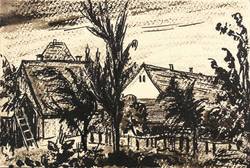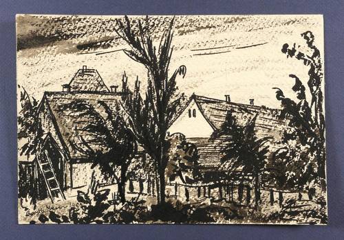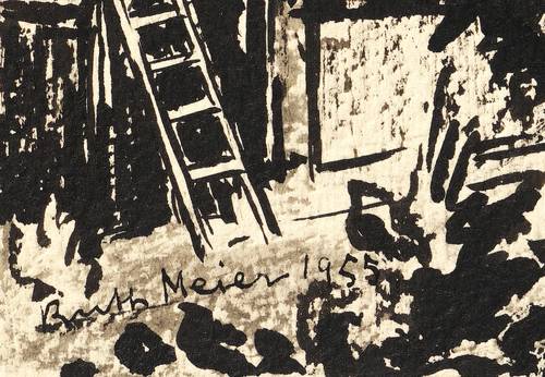 1955. Zeichnung / Pinselzeichnung, in schwarzer Tusche, grau laviert, auf Aquarellkarton. – Originale Künstlergrafik, von Ruth Meier. – Unikat. – 17,1 x 25,0 cm (Darstellung / Blatt).