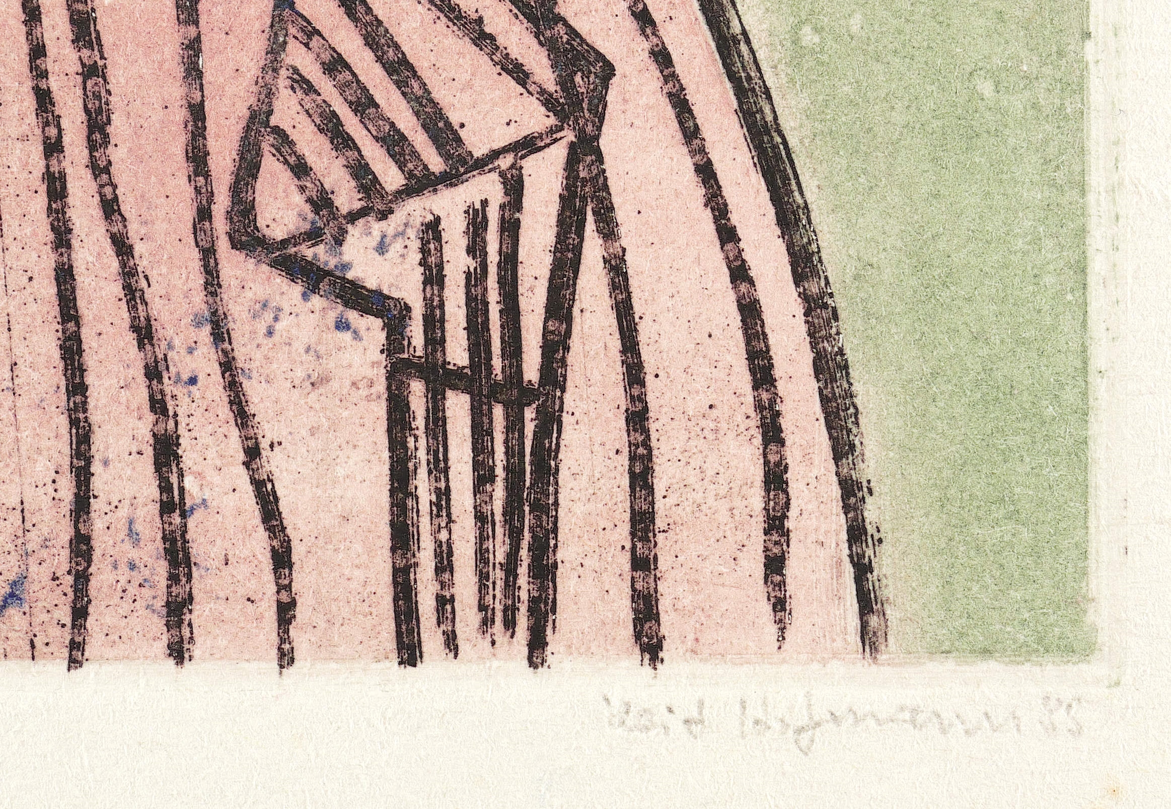 1985. Farbradierung / Aquatinta & Strichätzung, in Hellrot, Hellgrün & Schwarz, auf Büttenpapier. – Originale Künstlergrafik, von Veit Hofmann. – Auflage Exemplar Nr. 3/10. – 12,5 x 8,9 cm (Darstellung / Platte), 14,7 x 10,4 cm (Blatt).