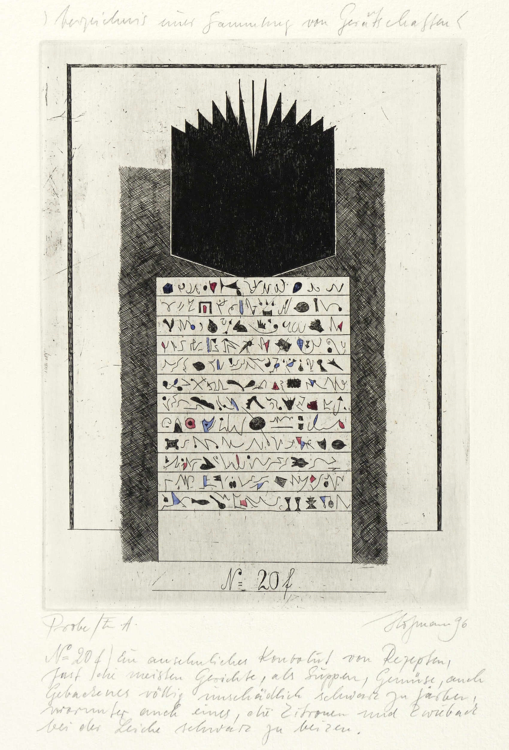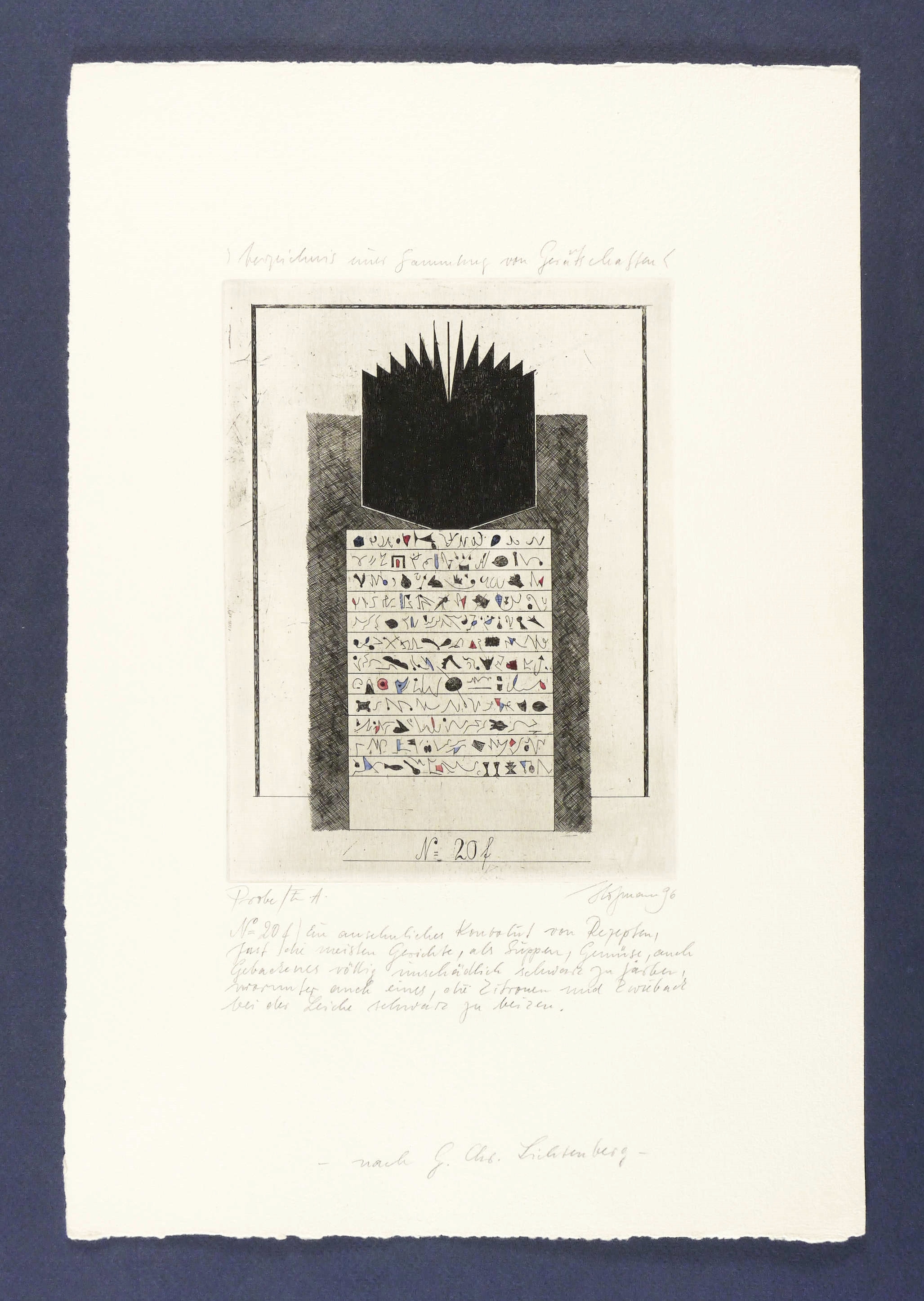 Rechts unten in Bleistift signiert und datiert. Links Auflagenbezeichnung. Oben Serien-Titel. Unten Titel und ausführliche Bezeichnung. – Blatt aus dem Radier-Zyklus zu Georg Christoph Lichtenberg und seinem phantastisch-bizzaren ″Verzeichnis einer Sammlung von Geräthschaften, welche in dem Hause des Sir H.S. künftige Woche öffentlich verauctioniert werden sollen″ (1798). – Ohne Mangel. Sehr guter Zustand.