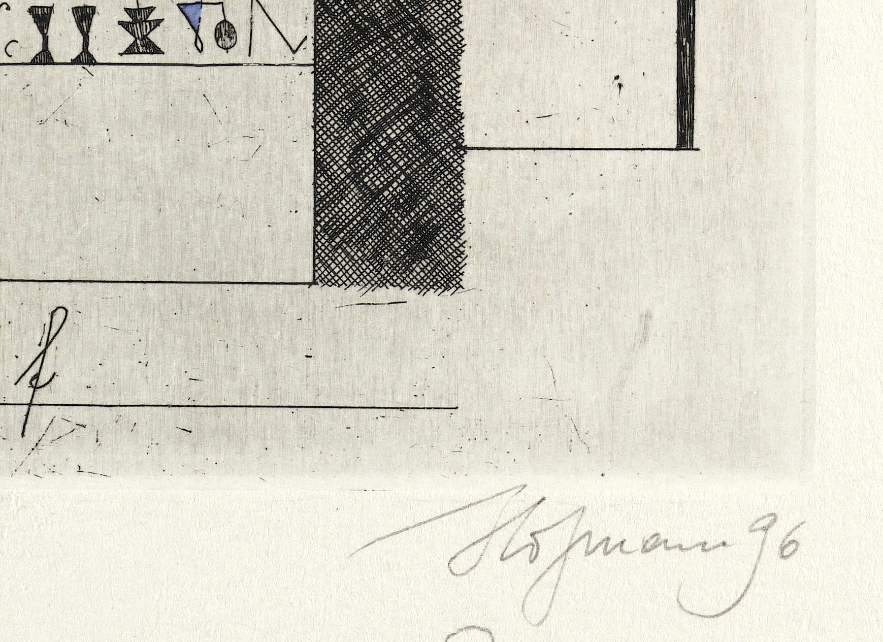 1996. Radierung / Strichätzung, in Schwarz, aquarelliert, auf Büttenkarton. – Von Günter Hofmann. – Probeexemplar. – 20,3 x 15,1 cm (Darstellung / Platte), 39,5 x 26,5 cm (Blatt).