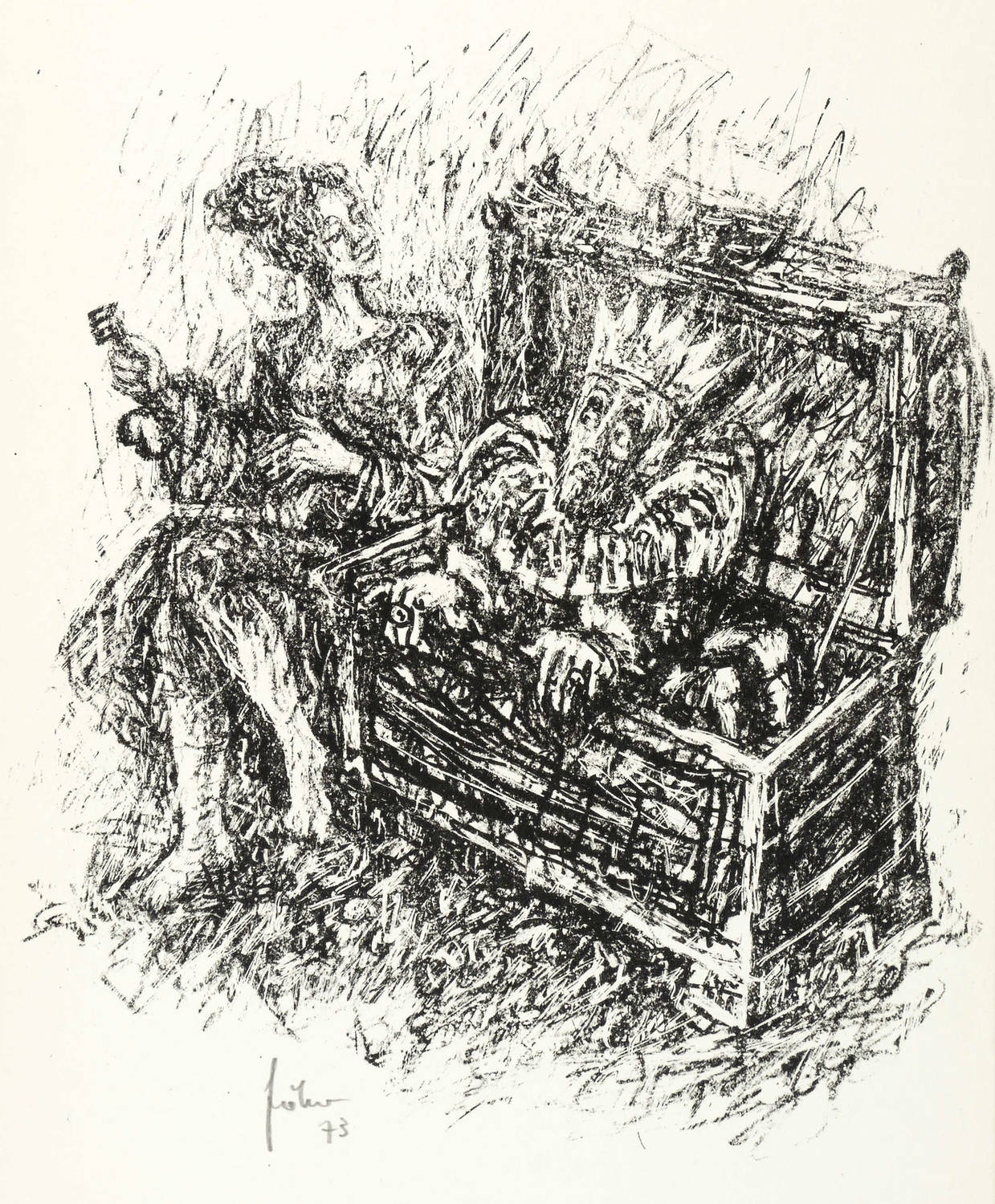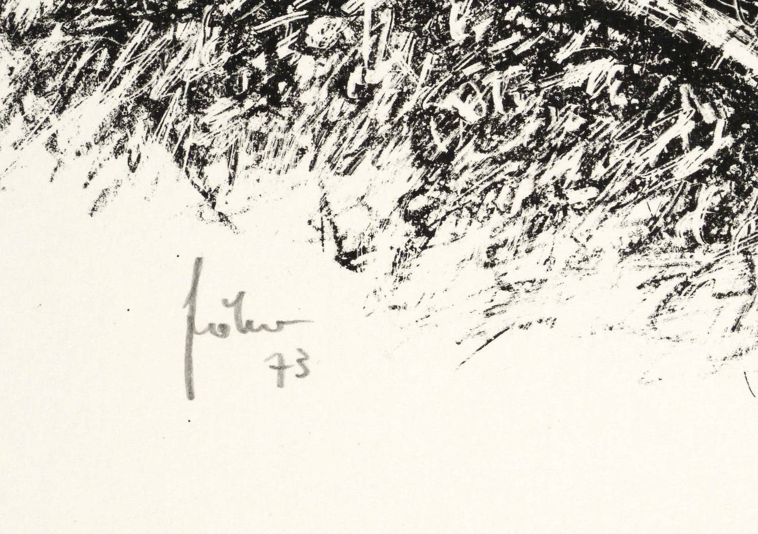 1973. Lithografie / Kreidelithografie, in Schwarz, auf hellchamois Karton. – Von Dietrich Fröhner. – 23,5 x 20,5 cm (Darstellung), 30 x 21 cm (Blatt).