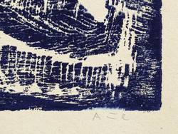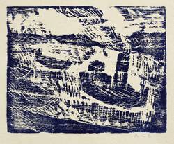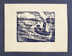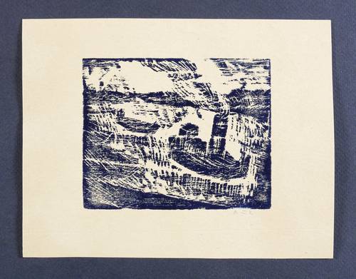 Um 1970. Holzschnitt, in Schwarzblau, auf rauem gelborange Papier. – Originale Künstlergrafik, von Jochen Aue. – 9,3 x 11,6 cm (Darstellung / Druckstock), 15 x 19 cm (Blatt).