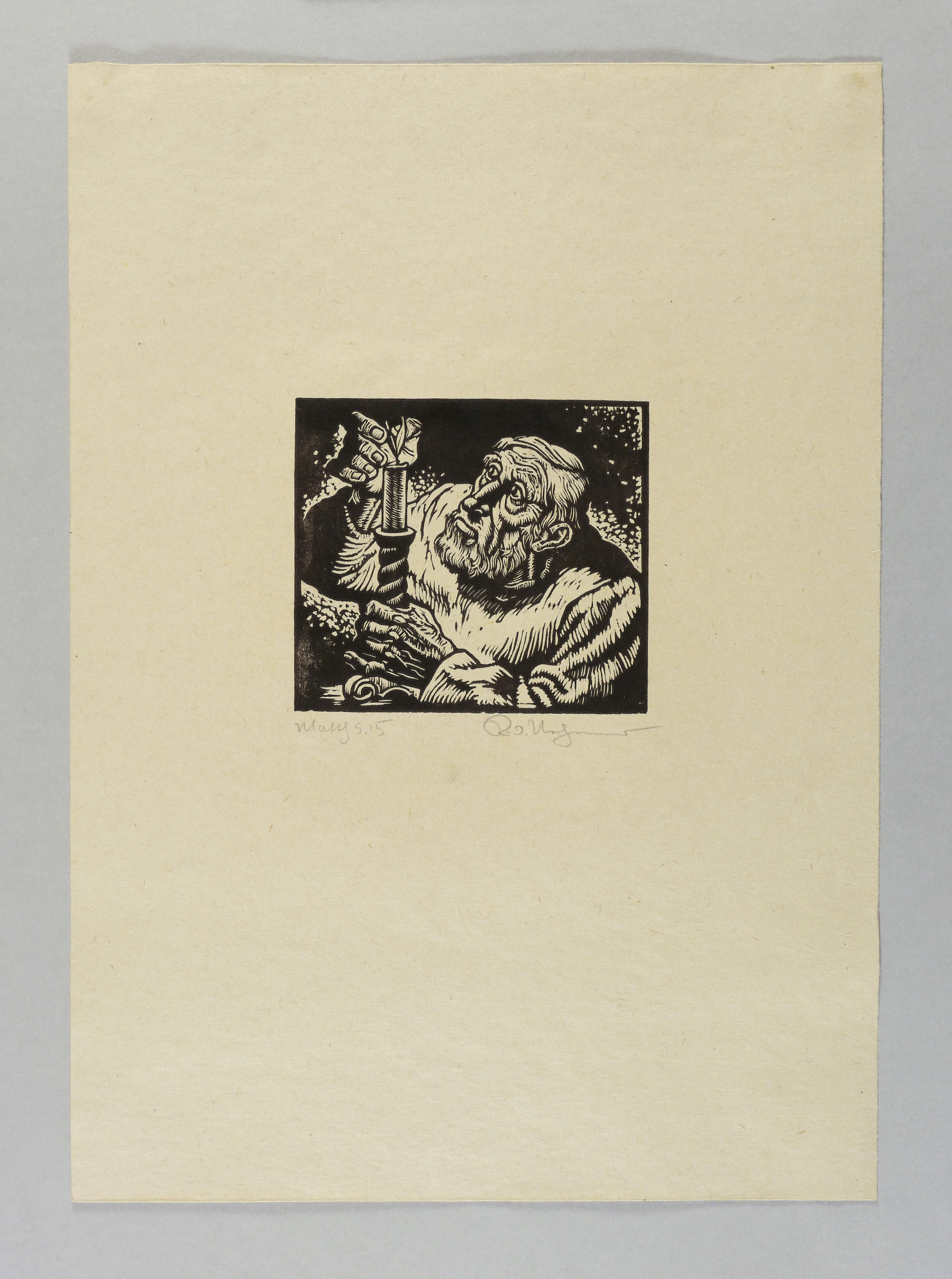 Rechts unten in Bleistift signiert. Links bezeichnet: ″Matth. 5.15″. – Blatt aus der bekannten Holzschnitt-Folge ″Die Bergpredigt″ zu Matthäus 5 15: ″Man zündet auch nicht ein Licht an und setzt es unter einen Scheffel, sondern auf einen Leuchter. So leuchtet es allen, die im Hause sind.″ – Tadelloses Exemplar. Verso minimale Montagespuren. Sehr guter Zustand.