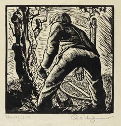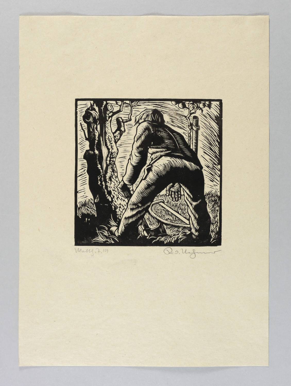 Rechts unten in Bleistift signiert. Links bezeichnet: ″Matth. 7.19″. – Blatt aus der bekannten Holzschnitt-Folge ″Die Bergpredigt″ zu Matthäus 7.19: ″Jeder Baum, der nicht gute Früchte bringt, wird abgehauen und ins Feuer geworfen. Darum, an ihren Früchten sollt ihr sie erkennen.″ – Tadelloses Exemplar. Verso minimale Montagereste. Sehr guter Zustand.