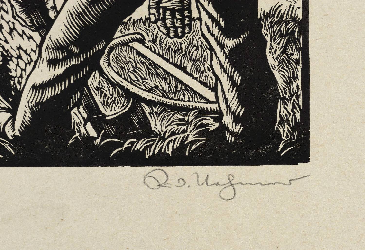 1948. Holzschnitt, in Schwarz, auf wolkigem gelbem Velin. – Originale Künstlergrafik, von Rudolf Nehmer. – 14,7 x 14,7 cm (Darstellung / Druckstock), 35 x 25 cm (Blatt).