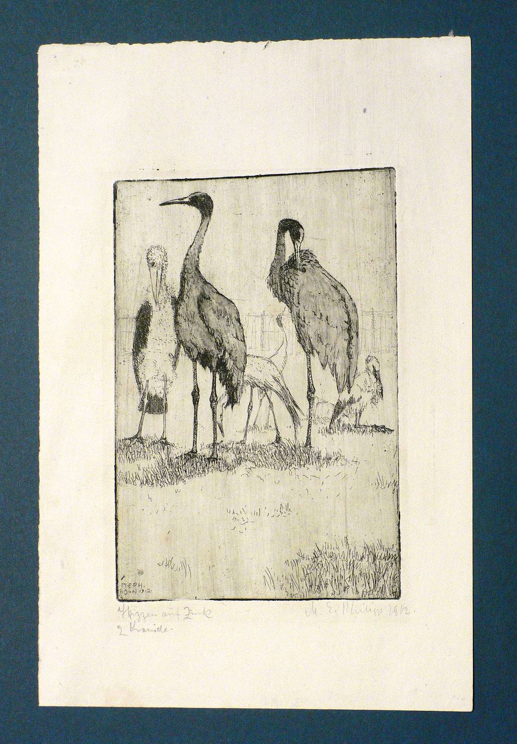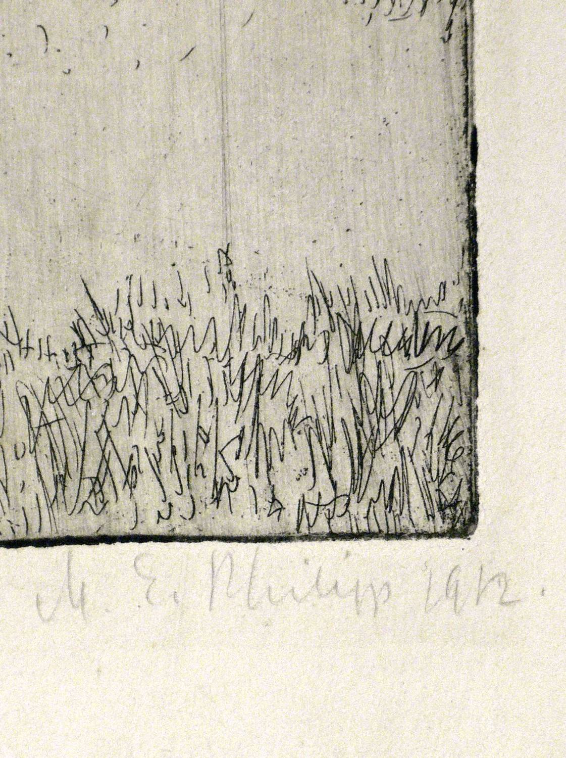 Götze A 90. – Rechts unten in Bleistift signiert und datiert: ″M.E. Philipp 1912″. In der Platte monogrammiert und datiert links unten. Links betitelt und bezeichnet: ″Skizzen auf Zink″. – Blattrand etwas berieben und leicht angeschmutzt. Verso Reste einer ehemaligen Montierung. Insgesamt guter Erhaltungszustand.