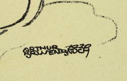 Arthur Brusenbauch (1881 Pressburg - 1957 Wien). Österreichischer Maler und Grafiker. Ausbildung zum Bühnenmaler. Danach zwei Jahre Architekturstudium. Ab 1918 Schüler von Rudolf Jettmar und Rudolf Bacher an der Wiener Akademie. Fresken, Glasfenster und Ölgemälde für das bischöfliche Alumnat in St. Pölten sowie Altarfresken in der dortigen Josefskirche. 1920-1939 Mitglied der Wiener Sezession. Ab 1938 Mitglied des Wiener Künstlerhauses. 1910 Preis der Stadt Wien. 1911 Silberne Medaille. 192 österreichischer Staatspreis. 1927 Erster Preis im Internationalen Wettbewerb "Für die beste Zeichnung" in New York. 1956 Goldener Lorbeer des Wiener Künstlerhauses.