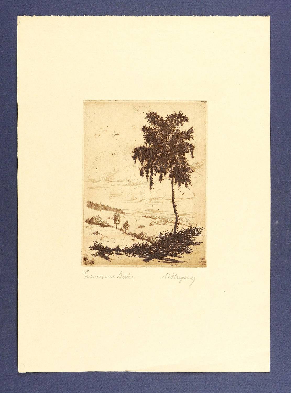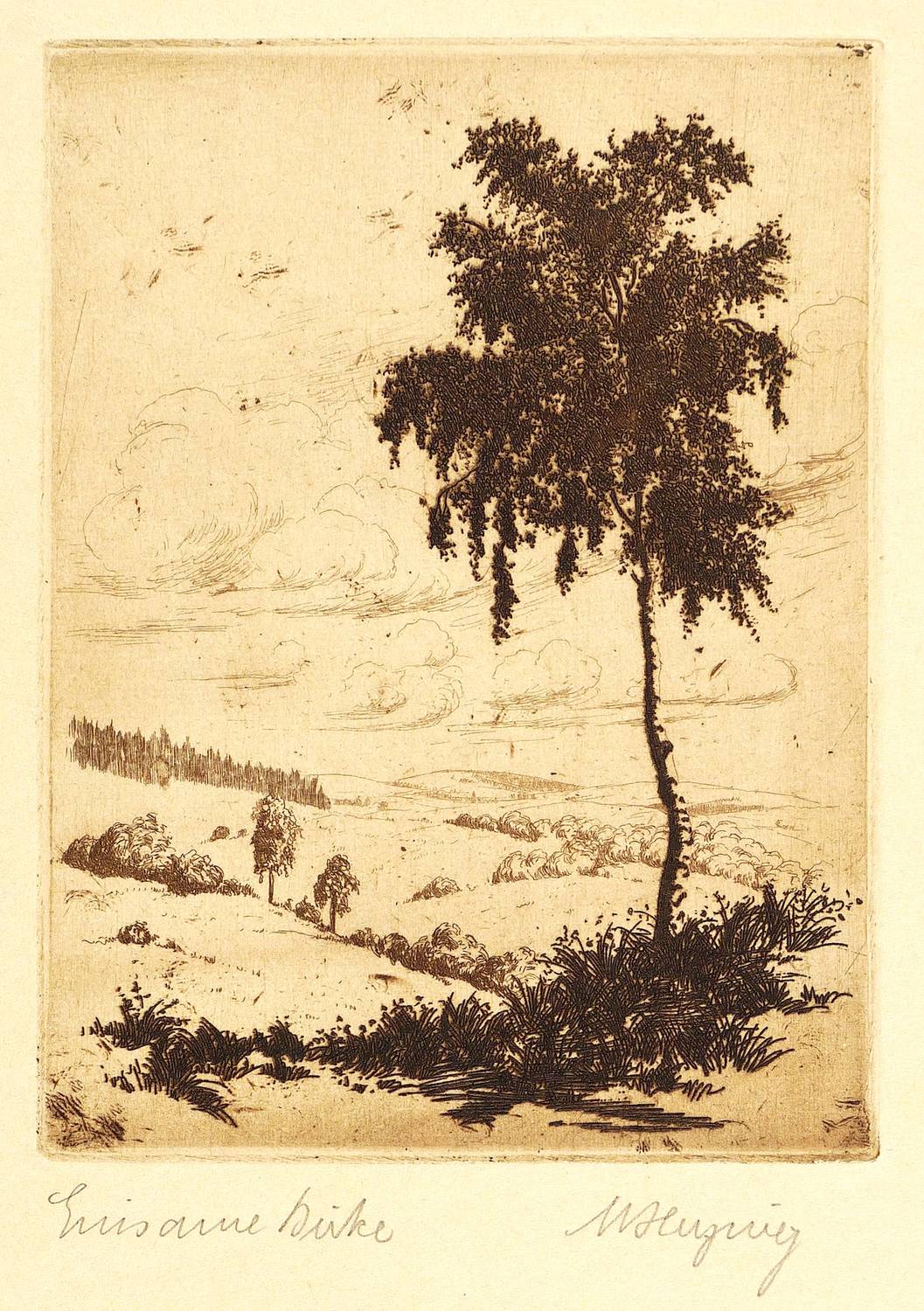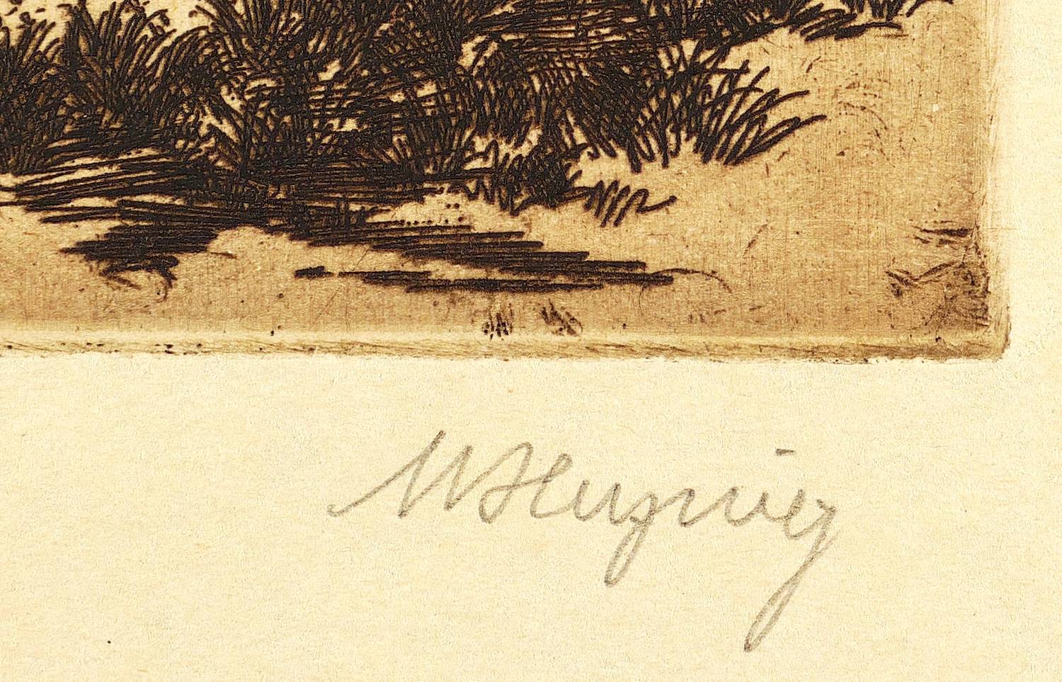 Um 1925. Radierung / Strichätzung, mit Plattenton, in Braunschwarz, auf gelbem Velin. – Originale Künstlergrafik, von Minni Herzing. – 14,5 x 10,8 cm (Darstellung / Platte), 31 x 22 cm (Blatt).