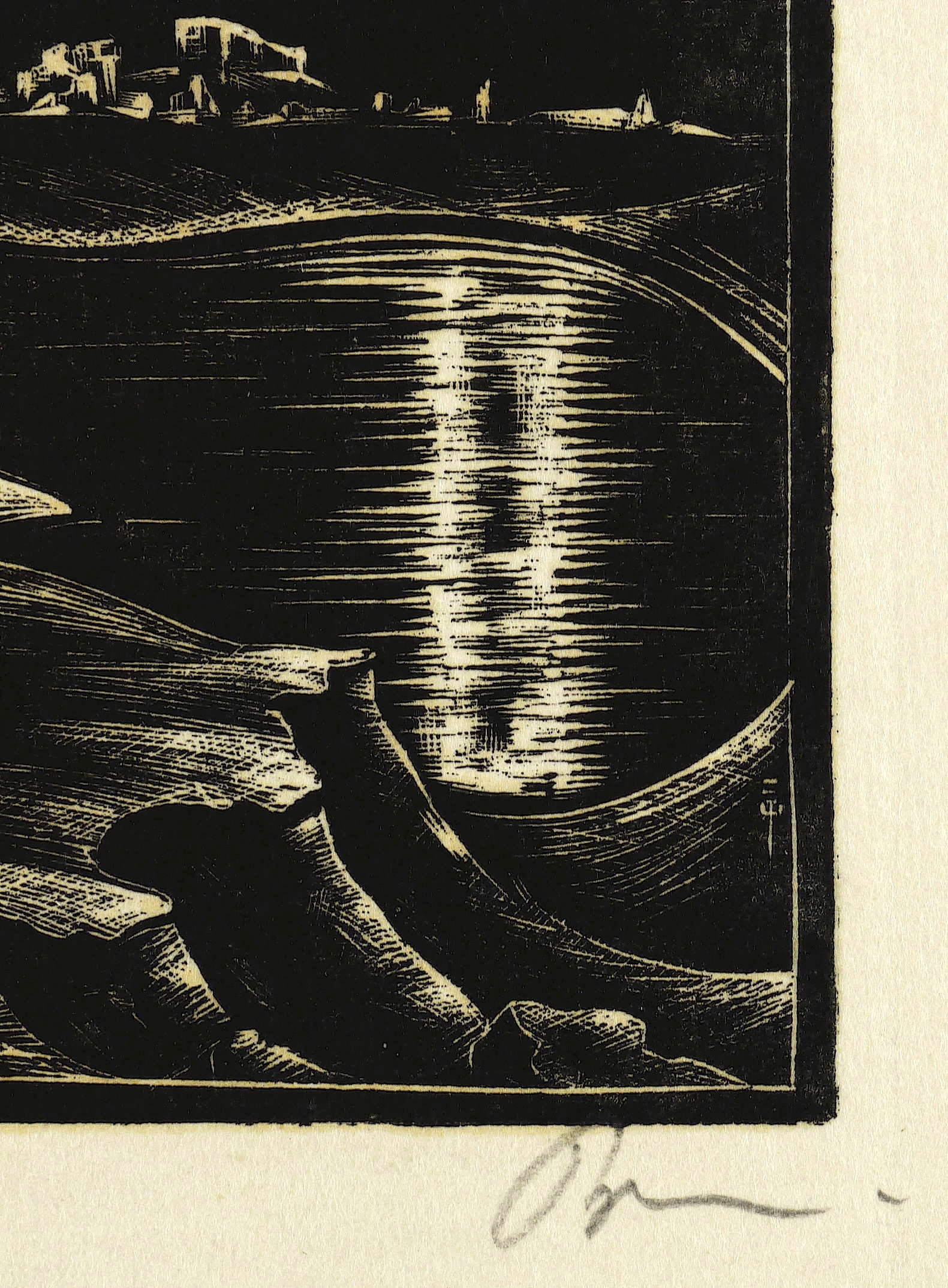 1923/1930. Holzschnitt, in Schwarz, auf feinem hellgelbem China. – Originale Künstlergrafik, von Walter Preisser. – Auflage Exemplar Nr. 69/100. – 10,8 x 14,2 cm (Darstellung / Druckstock), 16 x 19 cm (Blatt), 23,5 x 28,5 cm (Trägerkarton).