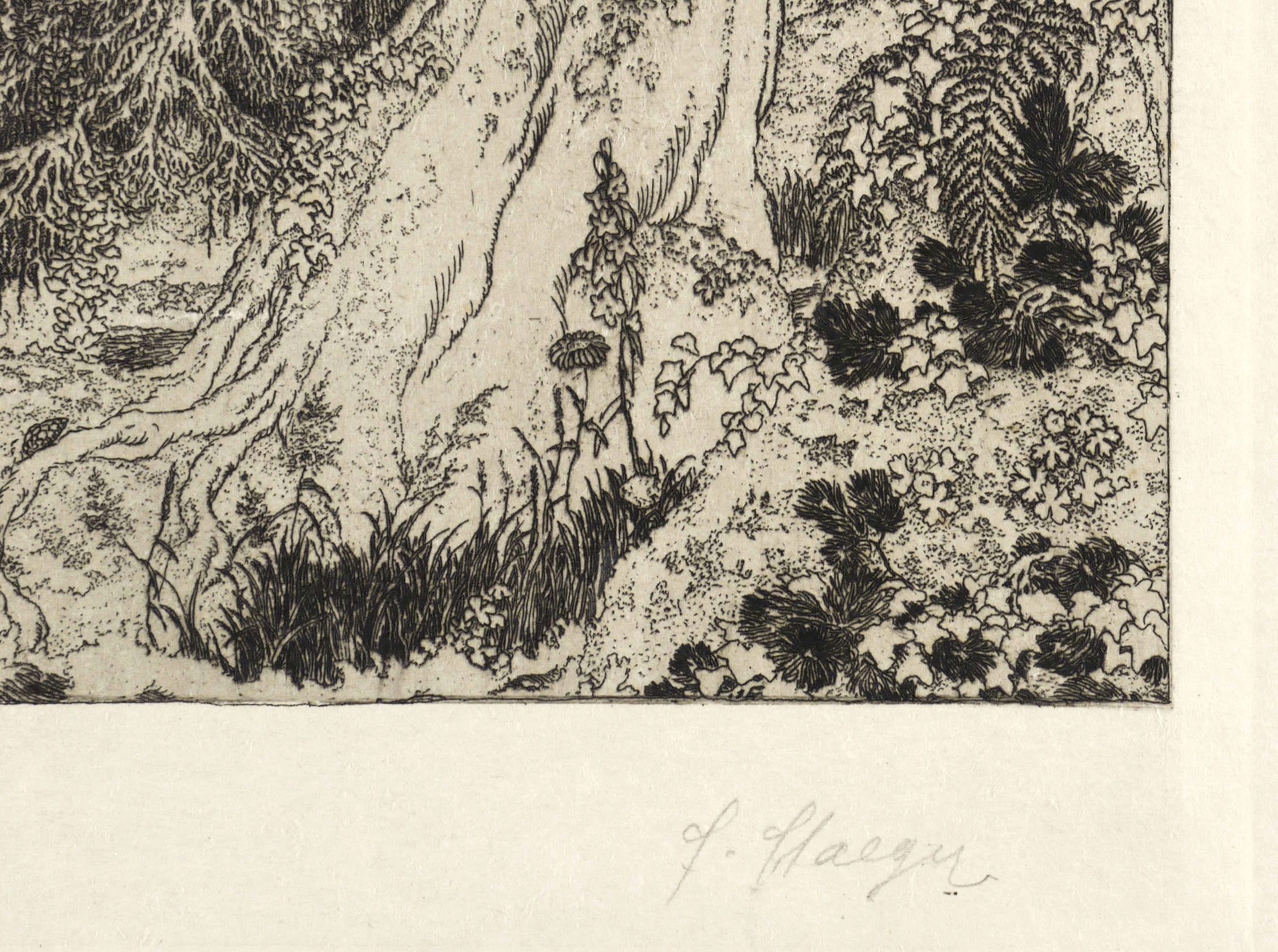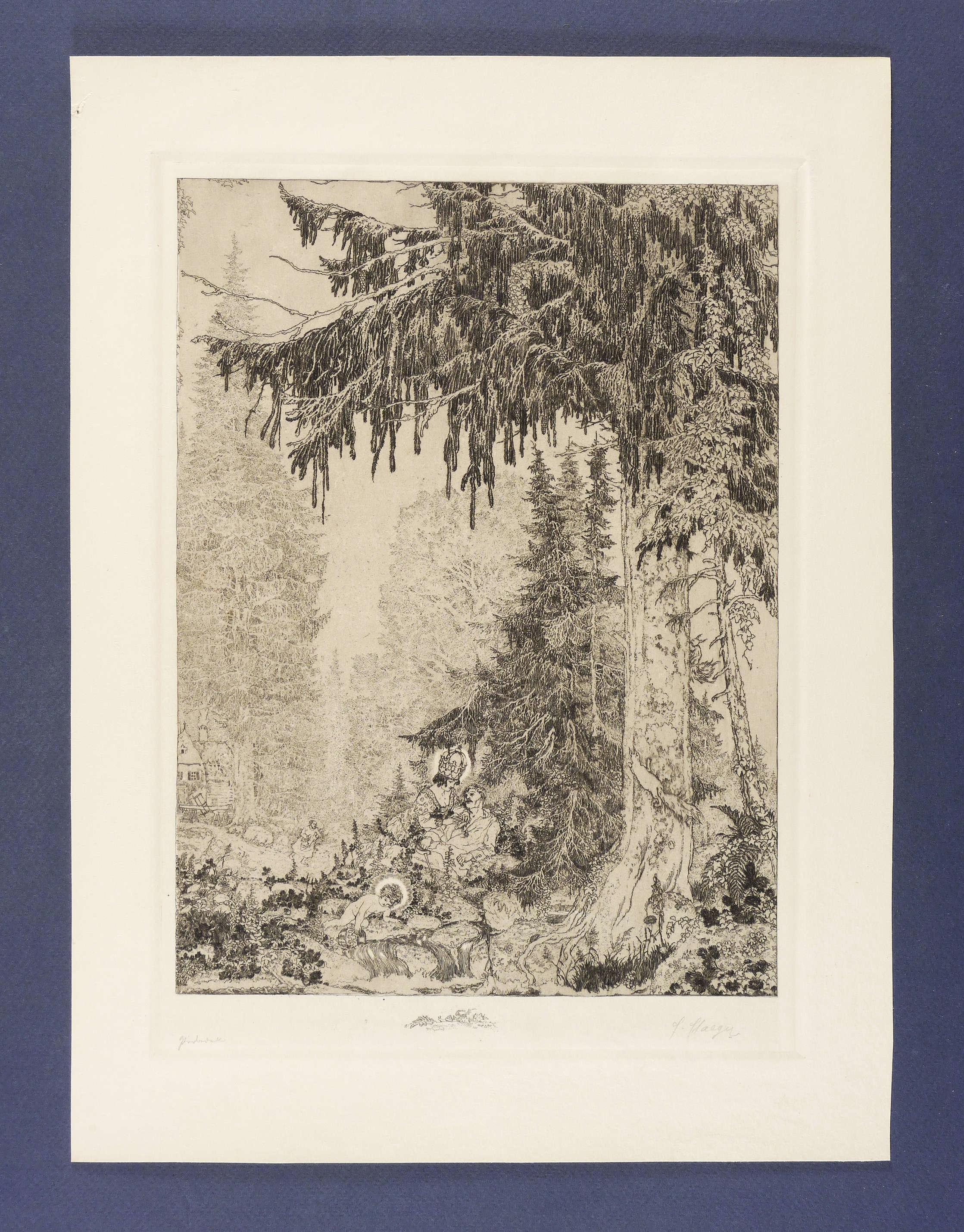 1918. Radierung / Strichätzung, in Schwarz, auf gelbem Kupferdruckkarton. – Originale Künstlergrafik, von Ferdinand Staeger. – Probedruck. – 29,4 x 21,7 cm (Darstellung / Einfassungslinie), 32,5 x 23,9 cm (Platte), 40 x 30 cm (Blatt).