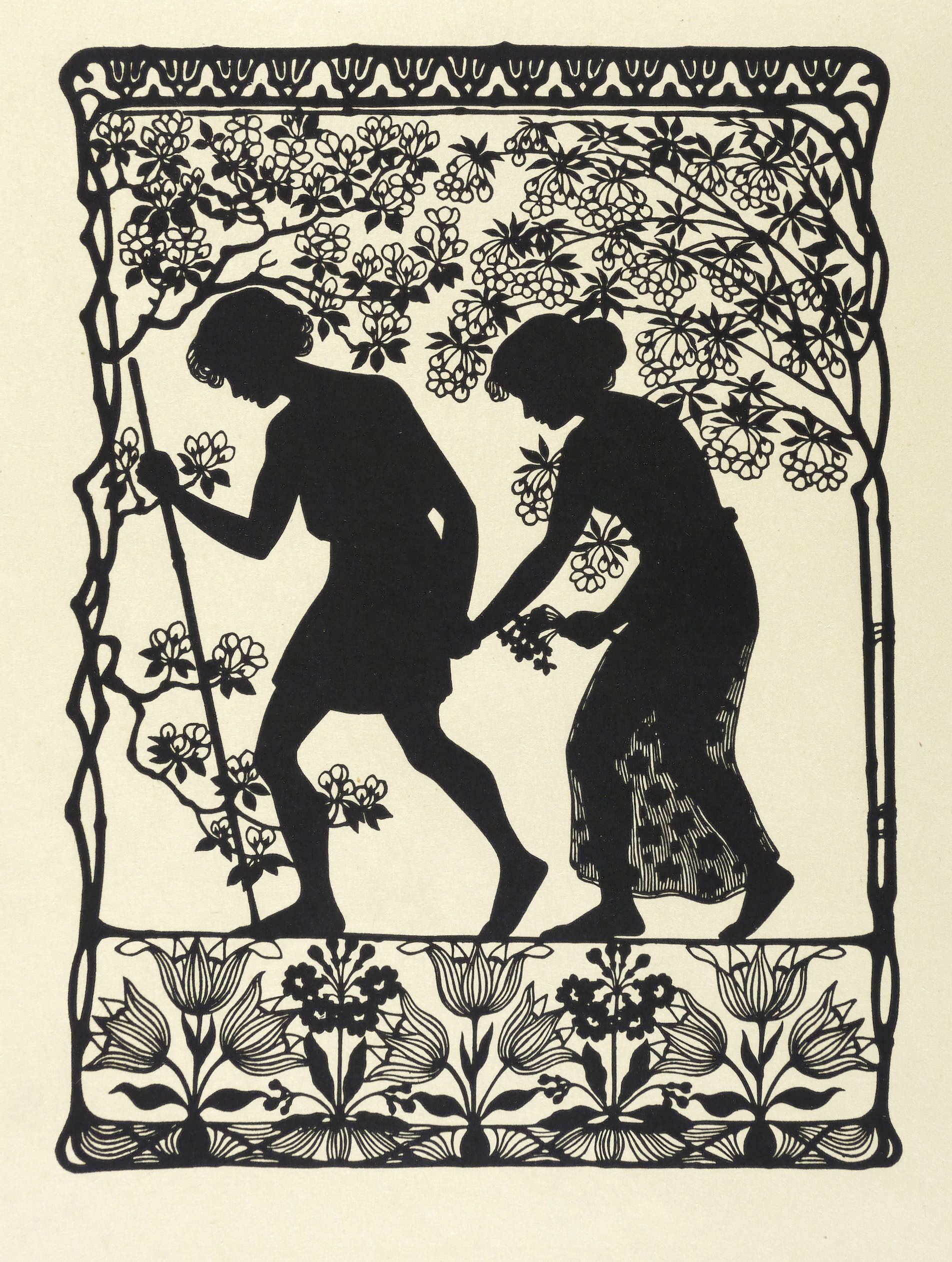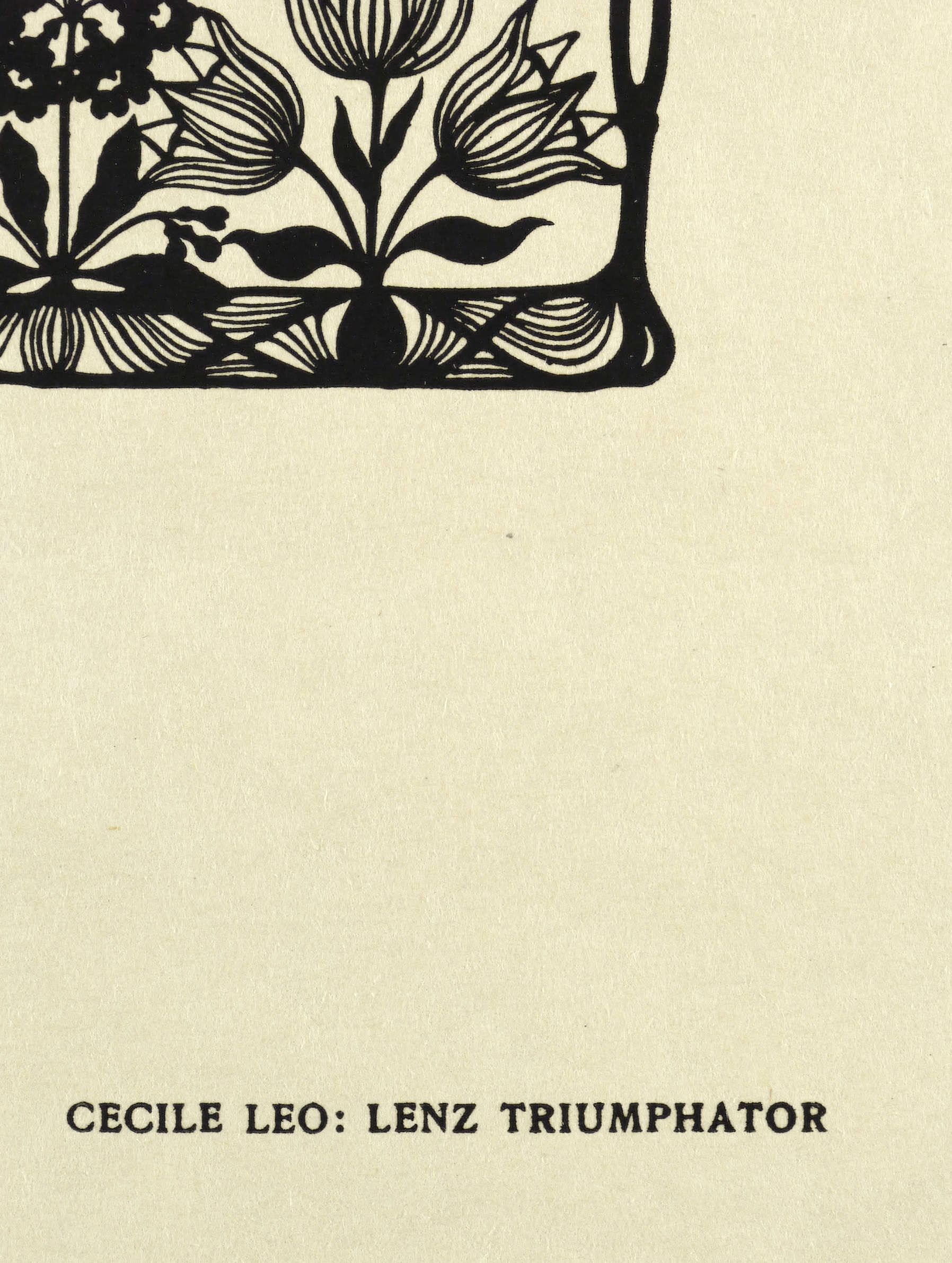 Aus: Cecile Leo, Schattenschnitte (München: Kunstwart - Georg D.W. Callwey 1914). – Rechts unten typografisch bezeichnet: ″CECILE LEO: LENZ TRIUMPHATOR″. – Zum Gedicht ″Lenz III (Triumphator)″ von Conrad Ferdinand Meyer: ″Frühling, der die Welt umblaut, / Frühling mit der Vöglein Laut, / Deine blühnden Siegespforten / Allerenden, allerorten / Hast du niedrig aufgebaut! // Ungebändigt, kreuz und quer, / Über alle Pfade her / Schiessen blütenschwere Zweige, / Dass dir jedes Haupt sich neige, / Und die Demut ist nicht schwer.″ – Tadellos. Sehr guter Zustand.