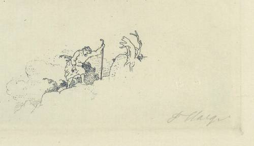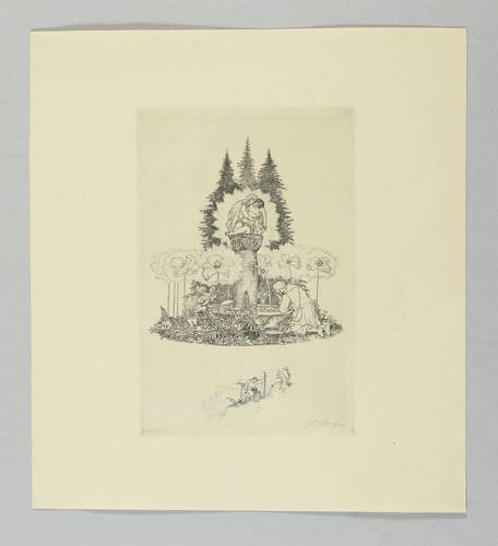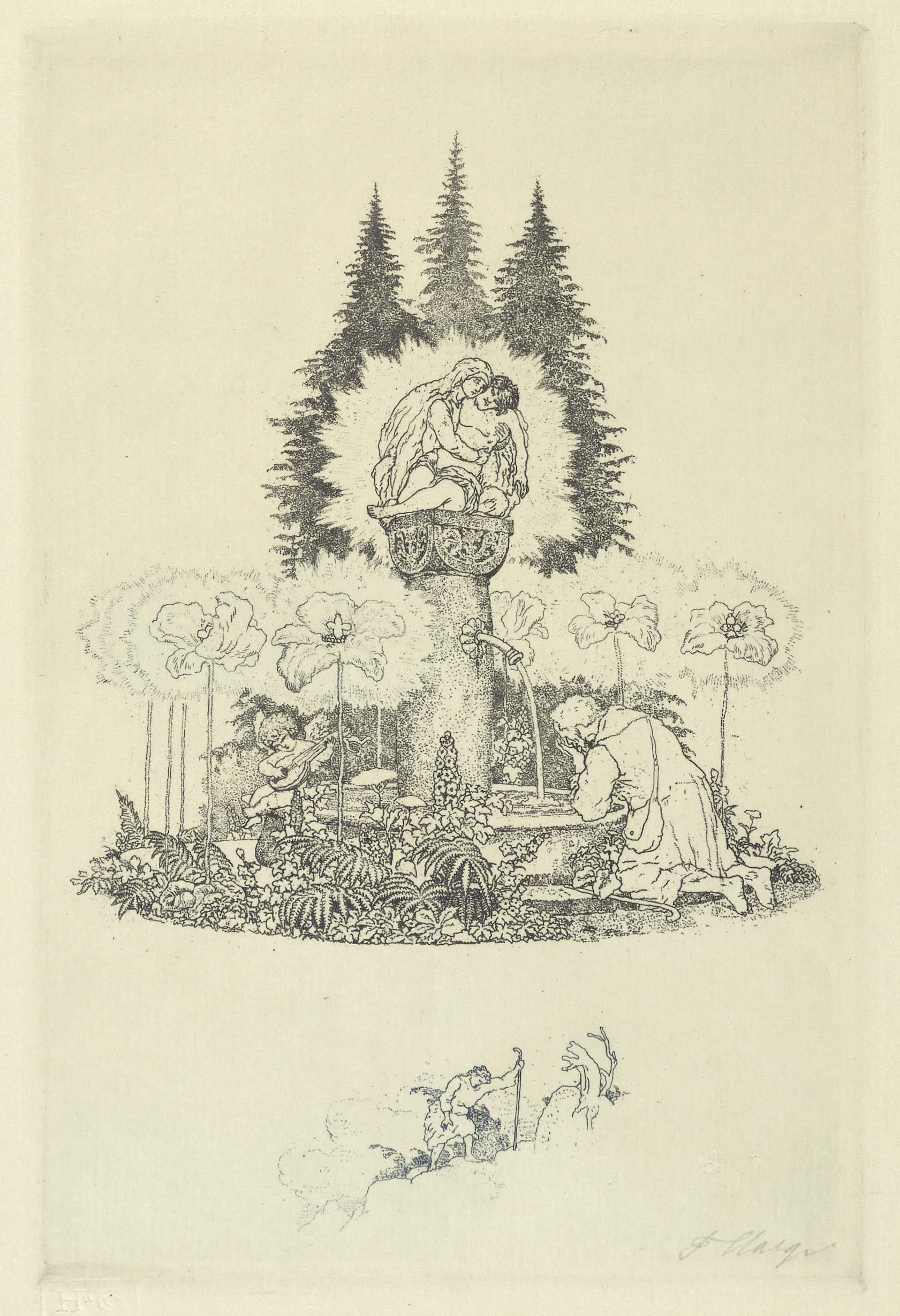 Muschler 274. – In der Platte rechts unten in Bleistift signiert: ″F. Staeger″. Links Trockenstempel des Verlegers Heinrich Graf, München. – Ein dürstender Pilger vor einem Brunnen kniend, auf dessen Rand ein Laute spielender Putto. Über dem romanischen Brunnenstock eine Pieta-Gruppe. – Sehr guter Zustand.